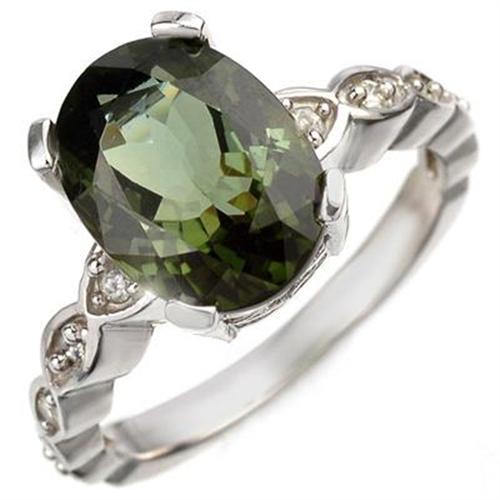 with an oval green tourmaline gemstone in the center. The ring shimmers with diamond accents along the front of the shank.<BR><BR>This October birthstone's name comes from the Sinhalese word 'turmali' and believed could