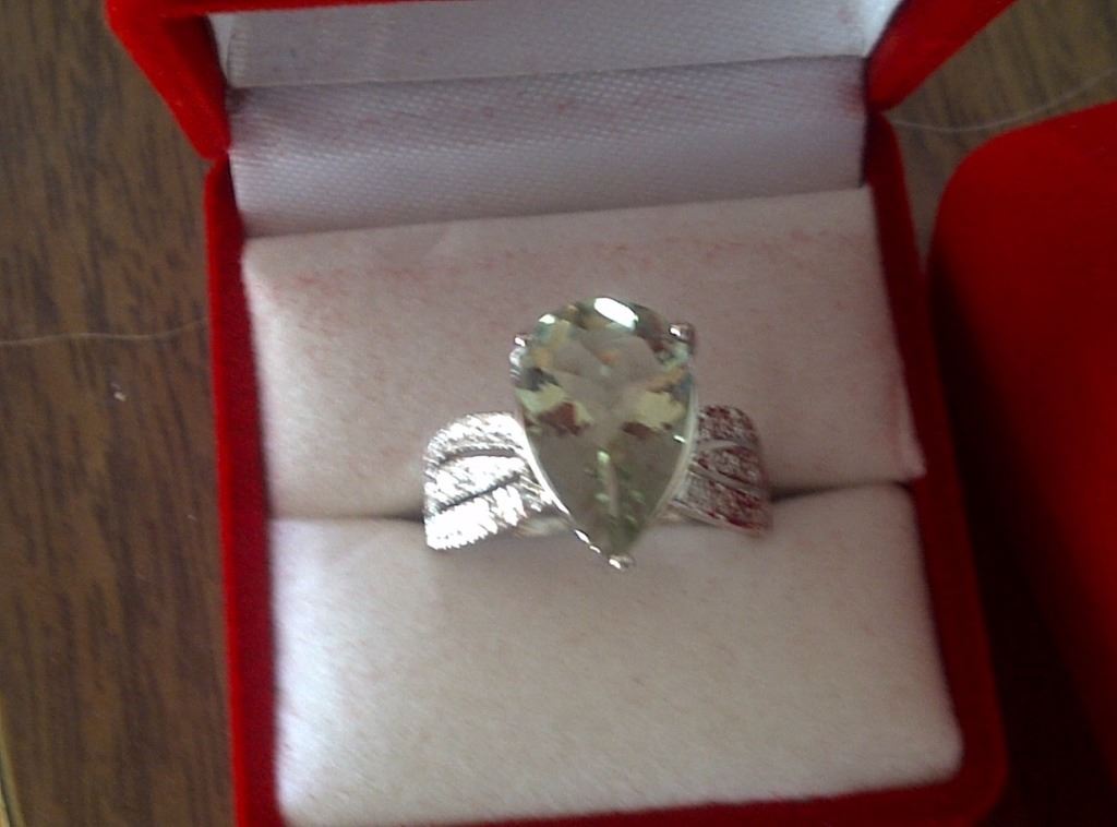 RING - 4.53CT PEAR FACETTED LIVELY GREEN YELLOW AMETHYST & 2 ROUND FACETTED ACCENT SHOULDER DIAMONDS IN STAMPED 925 STERLING SILVER SETTING WITH MAKERS MARK - INCLUDES CERTIFICATE $425 (W-120)
