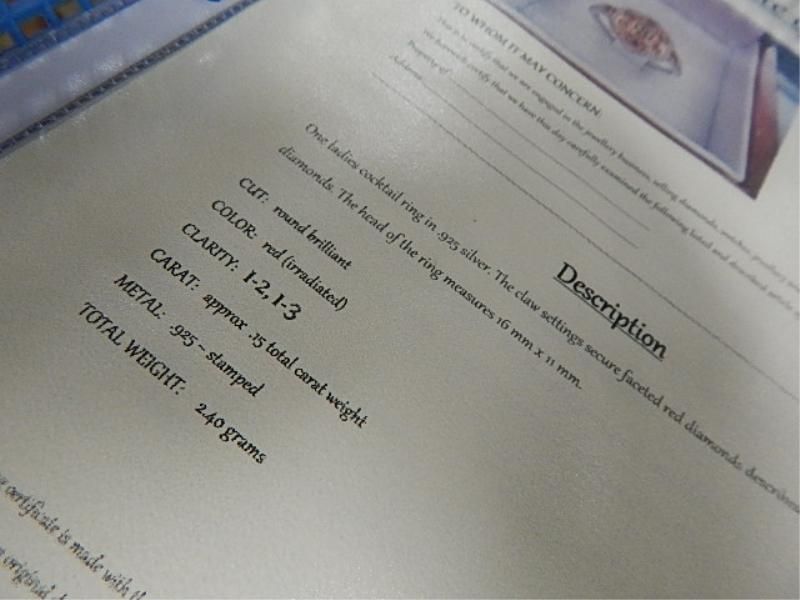 RING-COCTAIL RING - CERTIFICATE ESTIMATE $550 12 ROUND RED DIAMONDS - .925 SILVER
