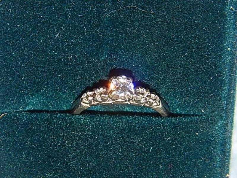 RING - CUSTOM MADE WHITE GOLD LADIES RING 18K GOLD STAMP AND A CLAW SETTING FIVE DIAMONDS ONE IN THE CENTER GUAGING 4.55MM - VS2, F.G, CUT - GOOD - 4 SMALL DIAMONDS SET ON THE RING (2 ON EACH SIDE) APROX. ..03CT EACH - TOTAL WEIGHT .12CT(SINGLE CUT)MOUN