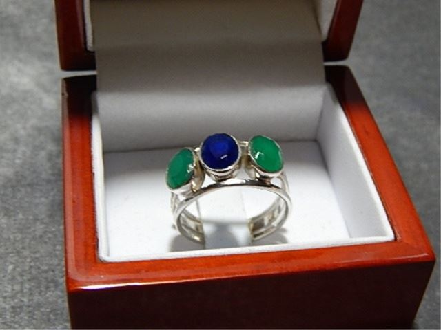 RING - NEW STERLING SILVER BLUE SAPPHIRE AND EMERALD RING