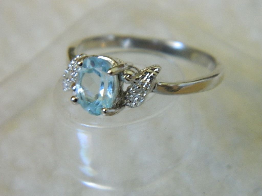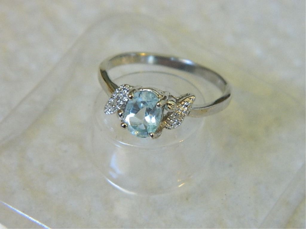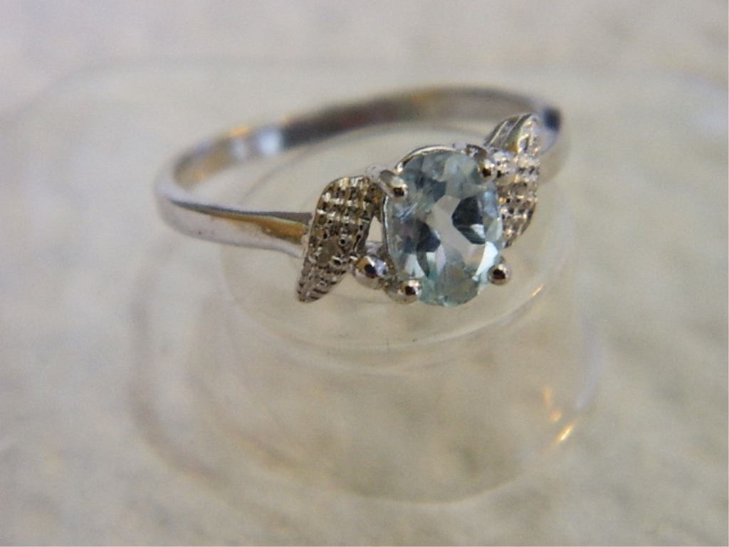 RING - OVAL FACETED LIVELY SKY BLUE TOPAZ & 2 DIAMONDS IN STERLING SILVER SOLITAIRE DESIGNED SETTING - RETAIL ESTIMATE $275