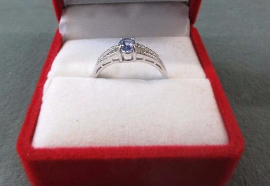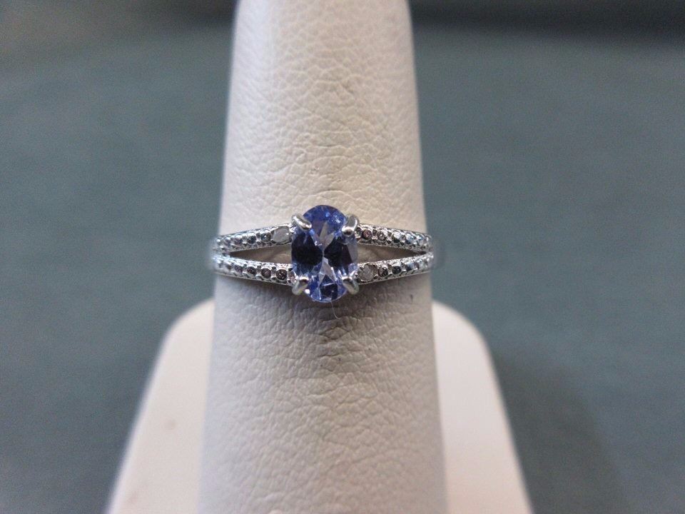 RING - OVAL FACETED TANZANITE & 2 DIAMOND IN STERLING SILVER SOLITAIRE SETTING - RETAIL ESTIMATE $350