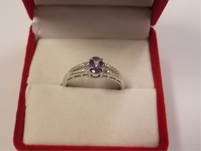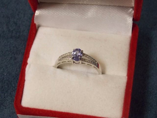 RING - OVAL FACETED TANZANITE & 2 DIAMOND IN STERLING SILVER SOLITAIRE SETTING - RETAIL ESTIMATE $350