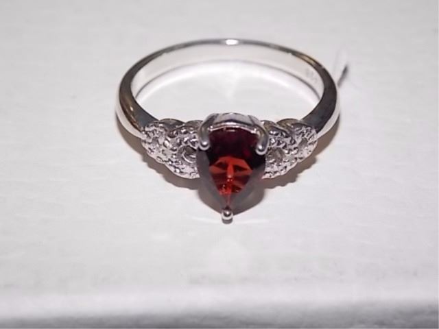 RING - PEAR FACETED GARNET & 2 DIAMONDS IN STERLING SILVER SETTING - RETAIL ESTIMATE $335