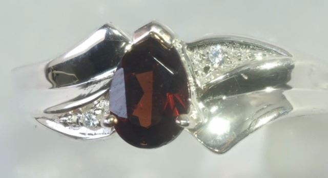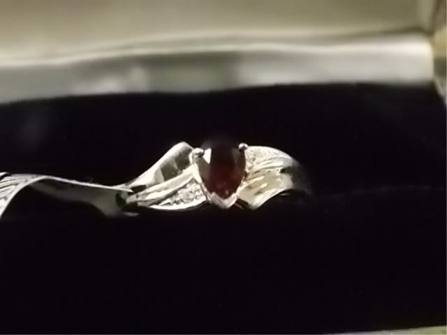 RING - PEAR FACETED GARNET WITH 2 SHOULDER GEMS IN STERLING SIILVER SETTING - RETAIL ESTIMATE $335