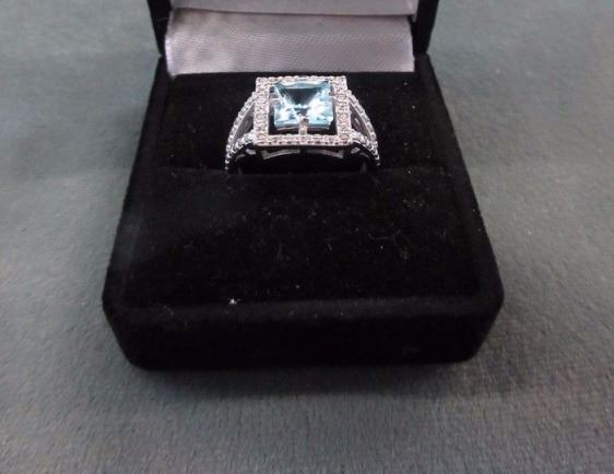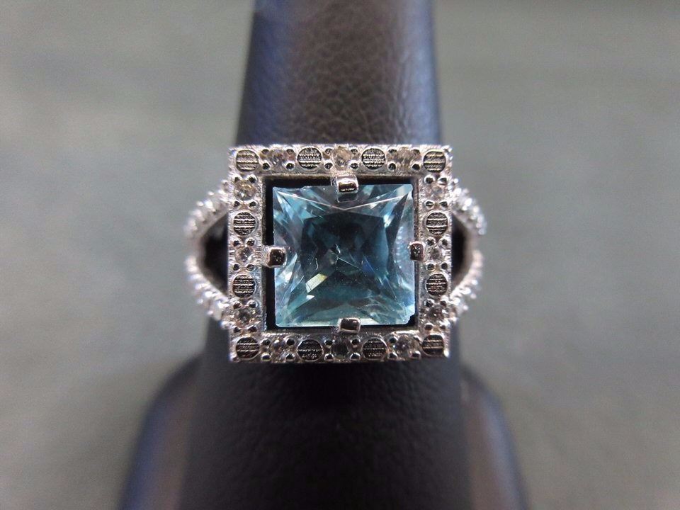 RING - PRINCESS FACETED LIVELY BLUE TOPAZ IN STERLING SILVER SETTING - RETAIL ESTIMATE $275