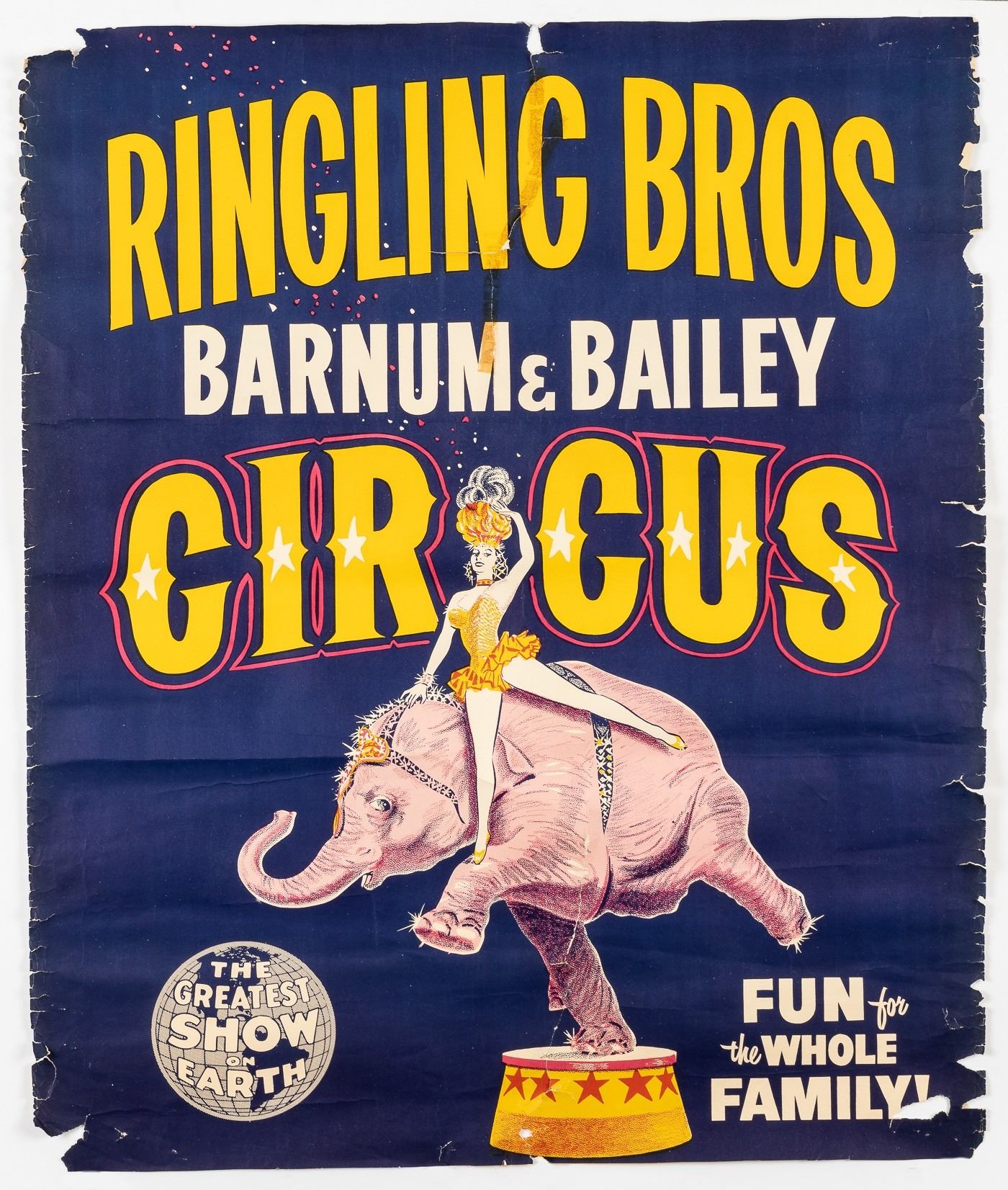 'Ringling Bros - Barnum & Bailey Circus', 1950s, 33.25 x 28 inches. Loss, tears, and chipping on edges, loss at top and bottom edges, loss at bottom right corner, loss of top and bottom left corners, 8-inch tear at lower center, 11-inch tear at top edge, poster is cut at top margin, and staining from old adhesive at top. Old and new tape repair on verso.