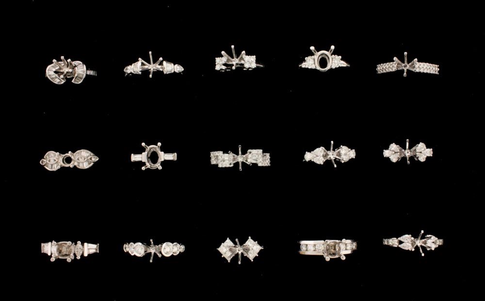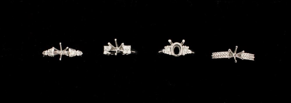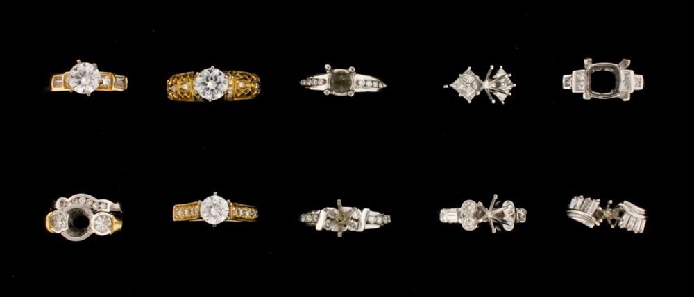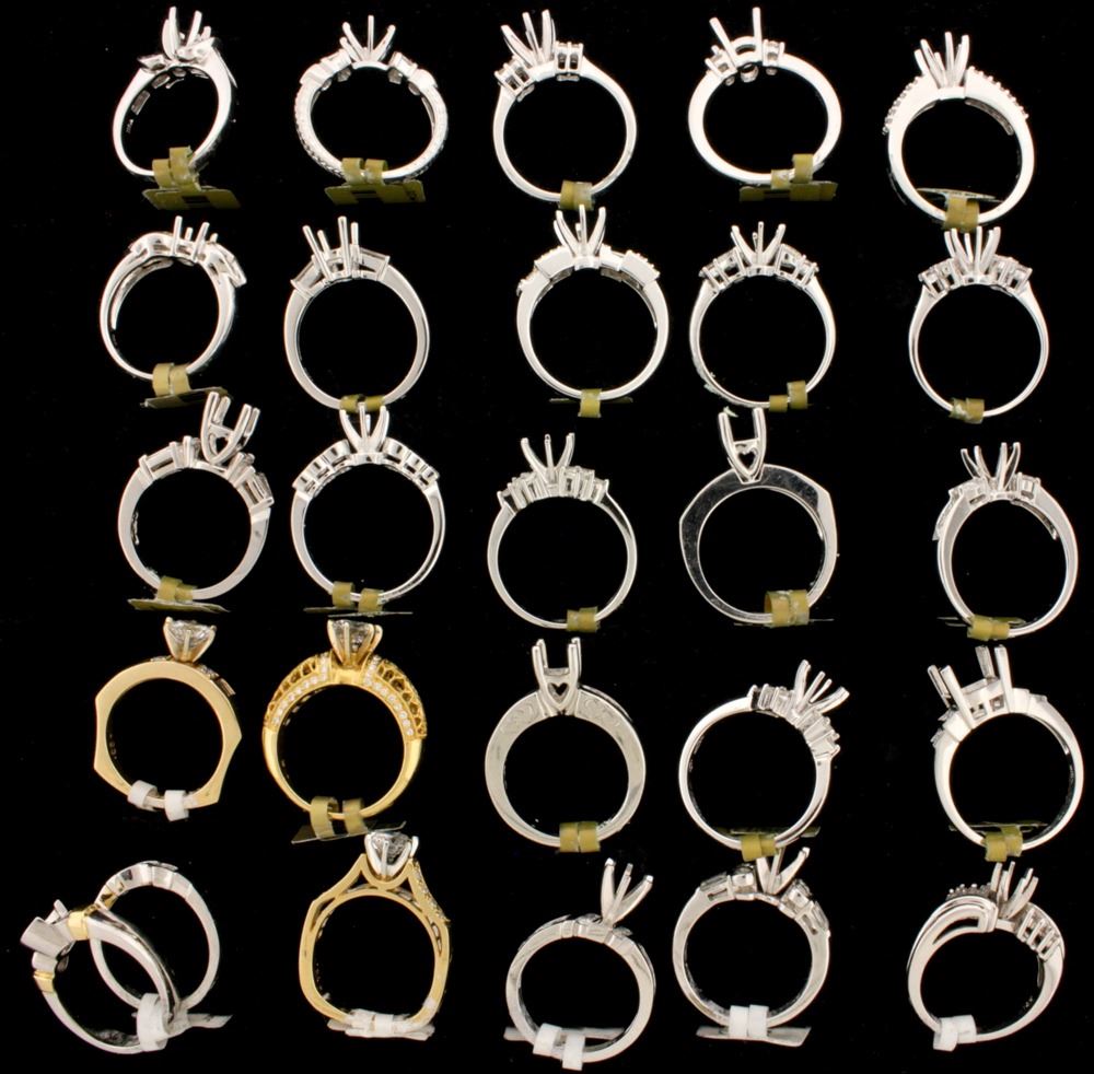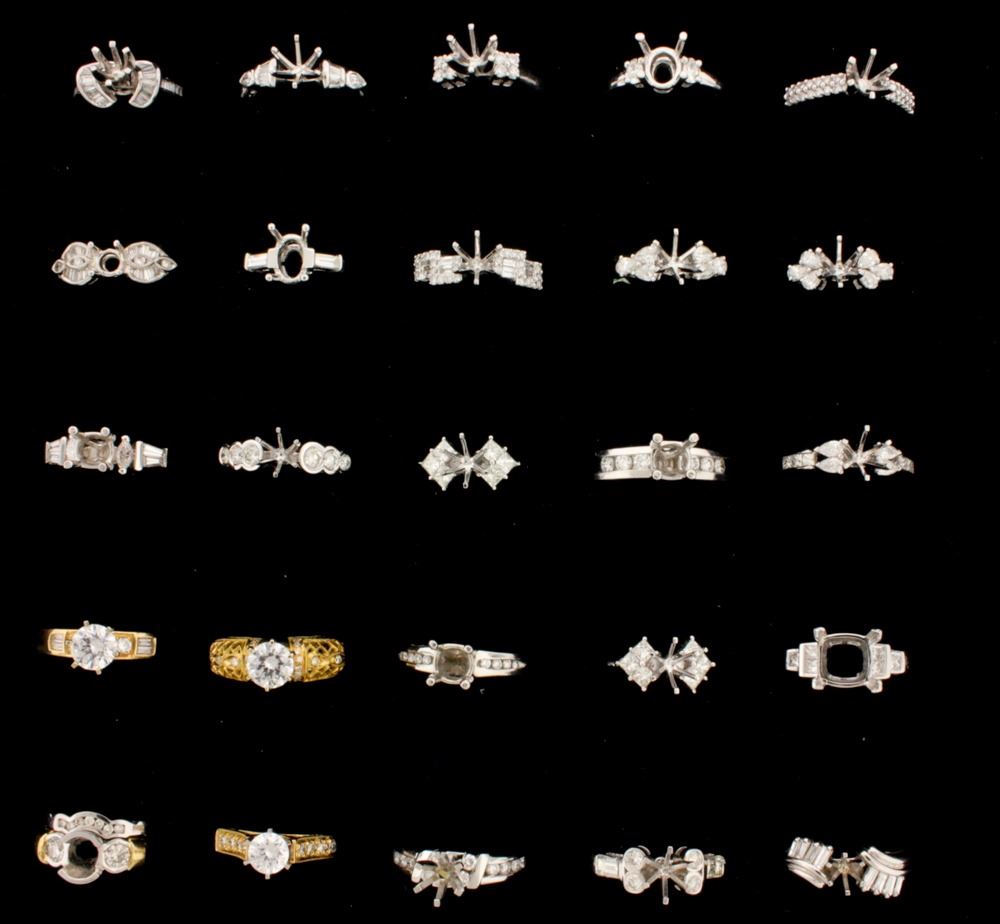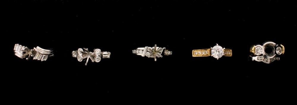 RINGS: [16] 18KWG & YG assorted semi-mount rings, set with diamonds, approx. 8.08 cttw., good/ G-I /VS-SI, (2 YG rings set with approx. 7mm synthetic colorless center stones), 85.6 grams; [5] 14KWG & YG assorted semi-mount rings including 1 wedding set, are set with diamonds, approx. 2.30 cttw., fair-good /H-K /VS-I1,(1 YG ring set with approx. 5.5mm synthetic colorless center stone), 29.7 grams; and [4] platinum semi-mount rings set with diamonds, approx. 1.24 cttw., good/ G-I/ VS-SI; 27.3 grams