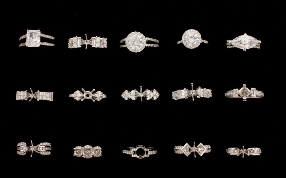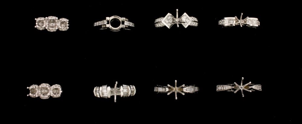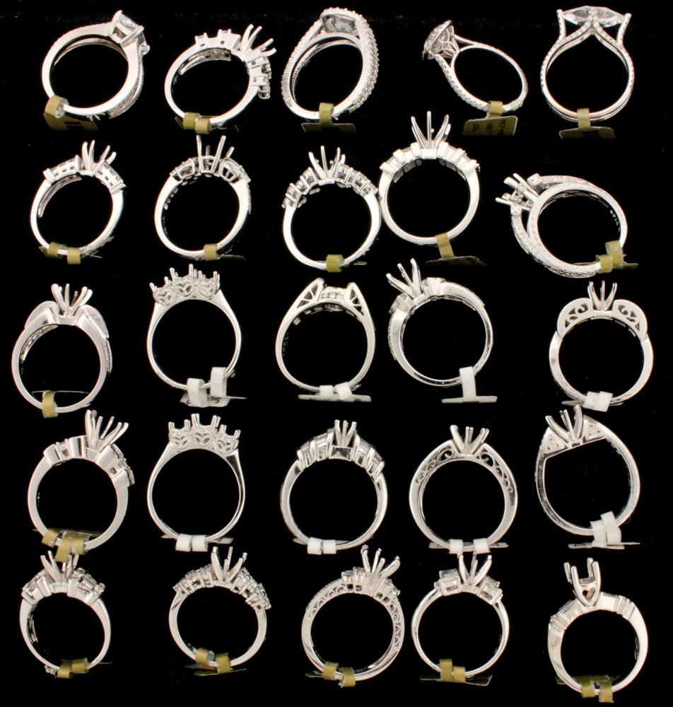 RINGS: [17] 18KWG assorted semi-mount, rings, set with diamonds, approx. 10.74 cttw., good/ G-I /VS-SI, (4 set with synthetic colorless center stones). 88.4 grams; and [8] 14KWG assorted semi-mount rings, set with diamonds, approx. 3.16 cttw., fair-good /H-K/ VS-I1, 37.9 grams