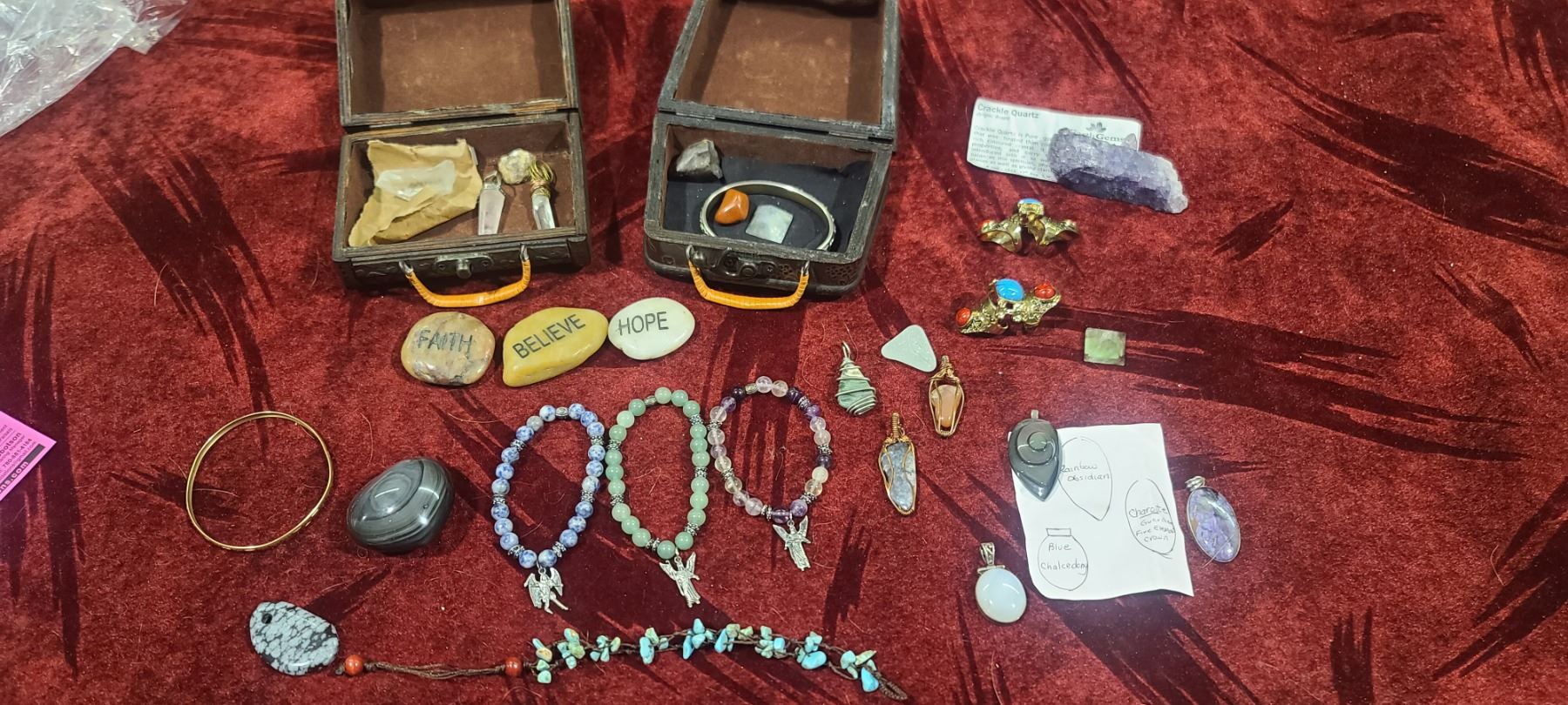 RINGS/ BRACELETTES/ STONES/ CRACKLE QUARTZ AND CRYSTALS WITH TWO WOODEN BOXES
