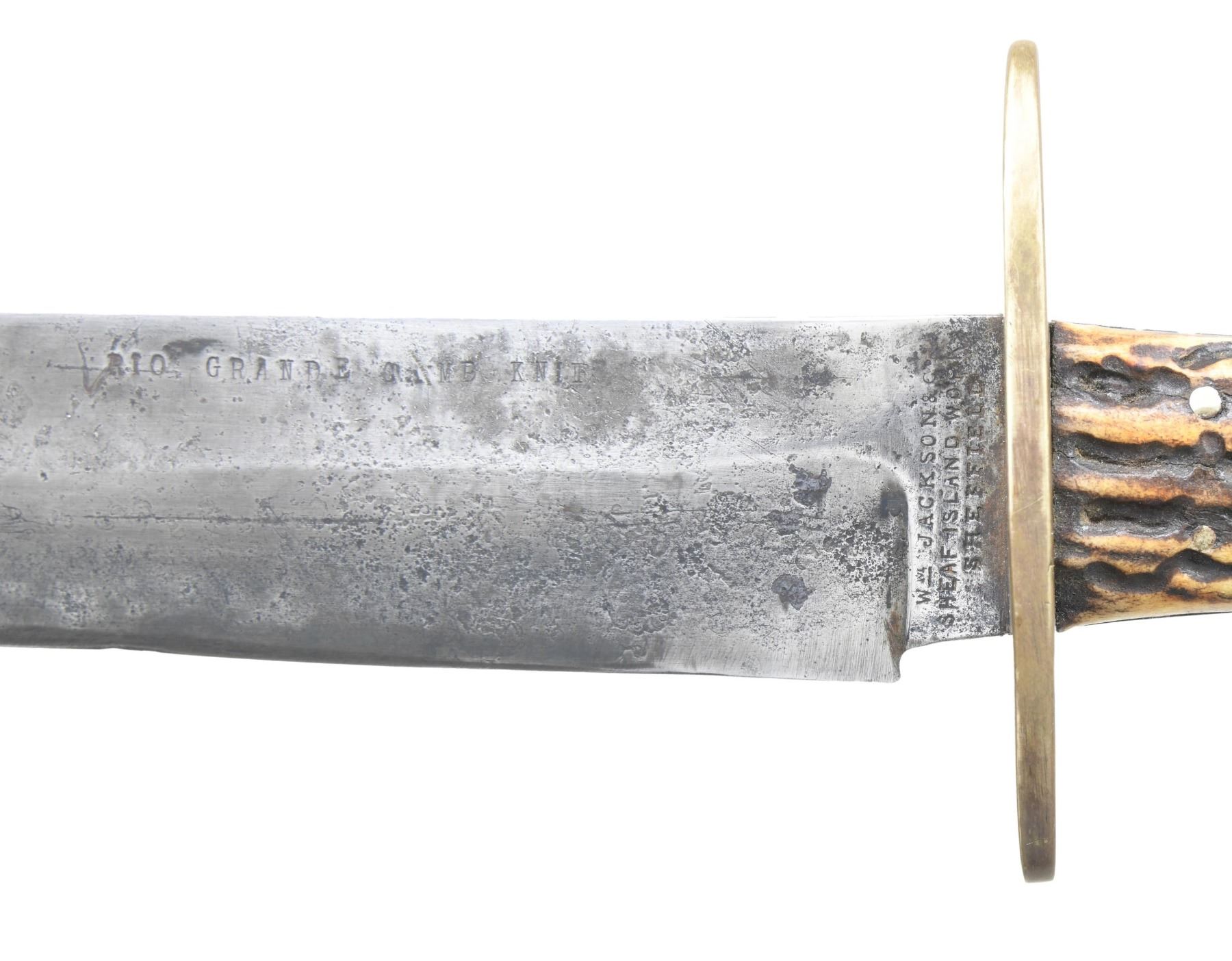 Well worn example of classic "William Jackson / Sheath Island Works / Sheffield" bowie with 8.5" stamped "Rio Grande Camp Knife". John Wilkes Booth famously carried similar knife when he assassinated Lincoln at Ford's theater. Most survivors of this popular import saw hard use losing blade form from repeated sharpening, like this survivor. CONDITION: good overall, blade heavily buffed, sharpened with staining and pitting but Mark's still good and discernible, blade was originally about 10" long. Well made leather sheath fits knife well. (02-24556/JS). NON-GUN. $1,500-3,000.