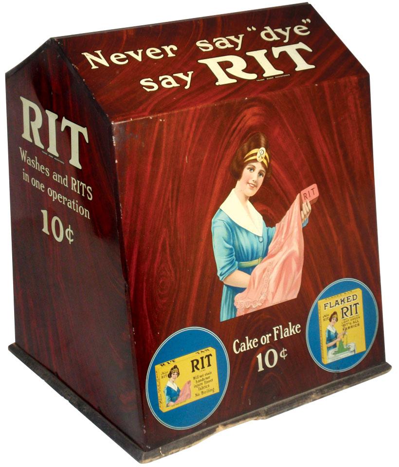 RIT Dye cabinet, slanted 6-drwr colorful litho on metal display picturing Miss Rit, Exc cond & color
