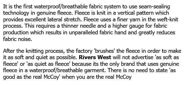 After the knitting process, the factory 'brushes' the fleece in order to make it as soft and quiet as possible. Rivers West will not advertise 'as soft as fleece' or 'as quiet as fleece' because it’s the only brand that uses genuine fleece in a waterproof/breathable garment.