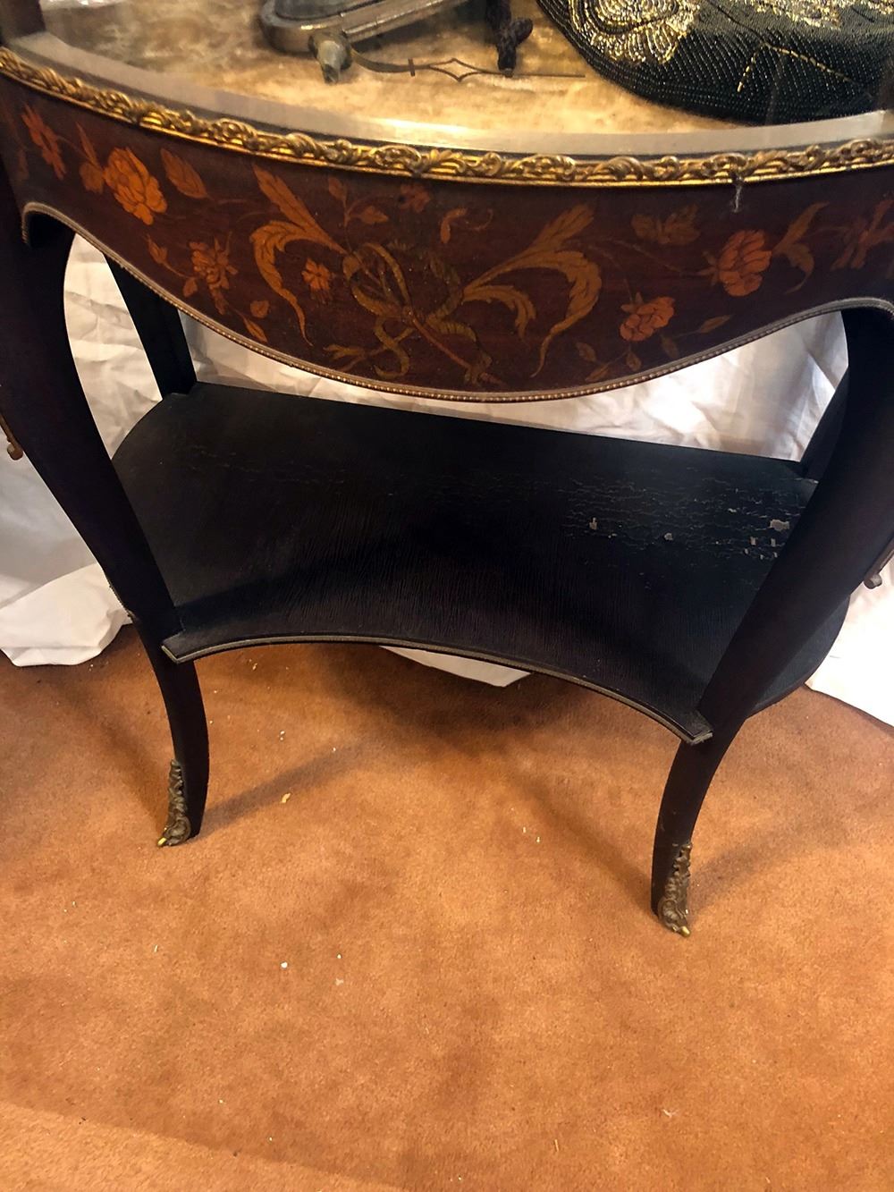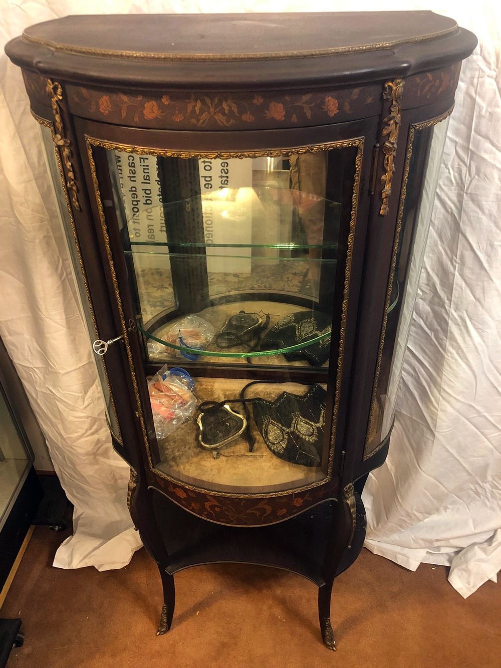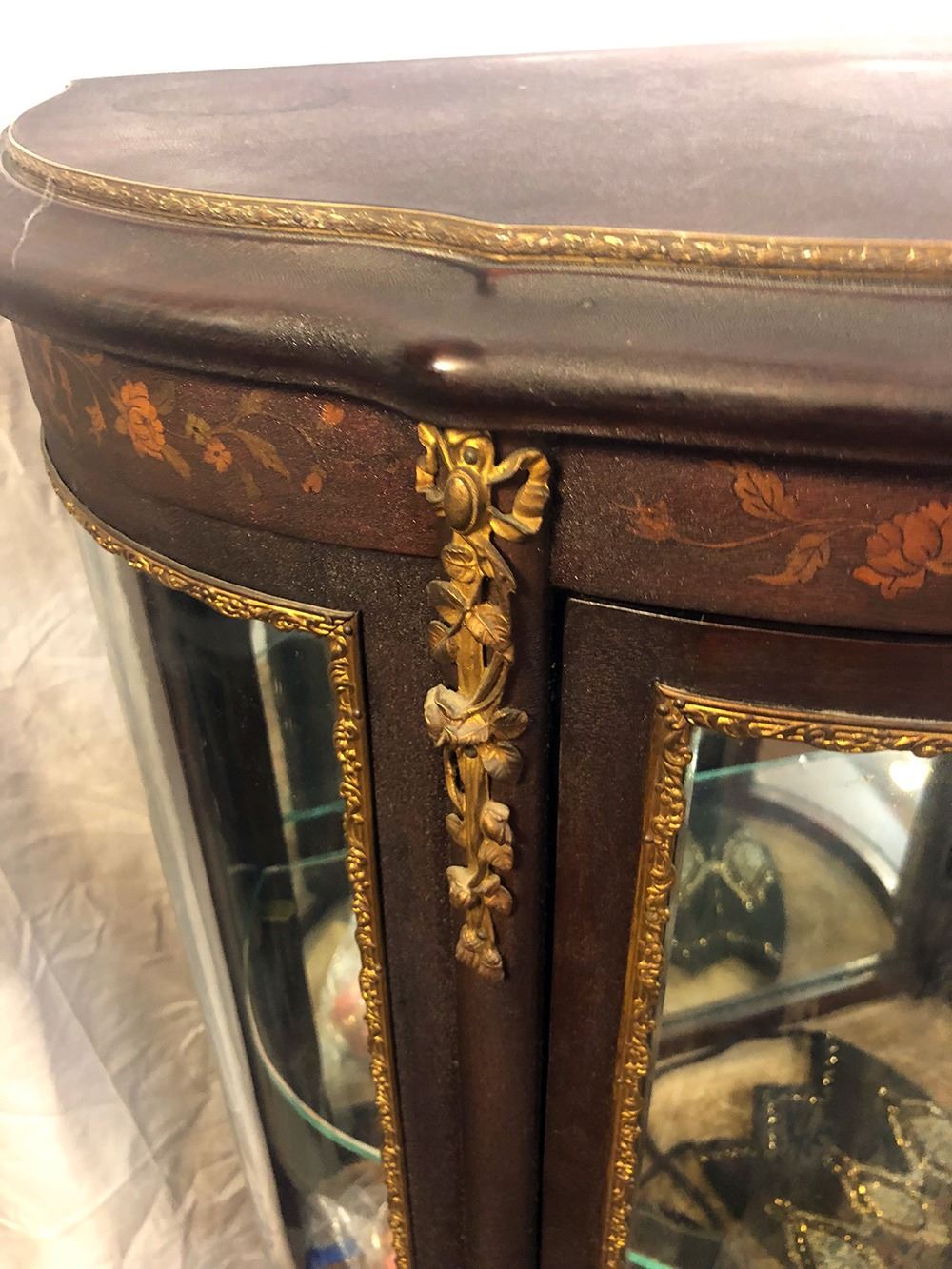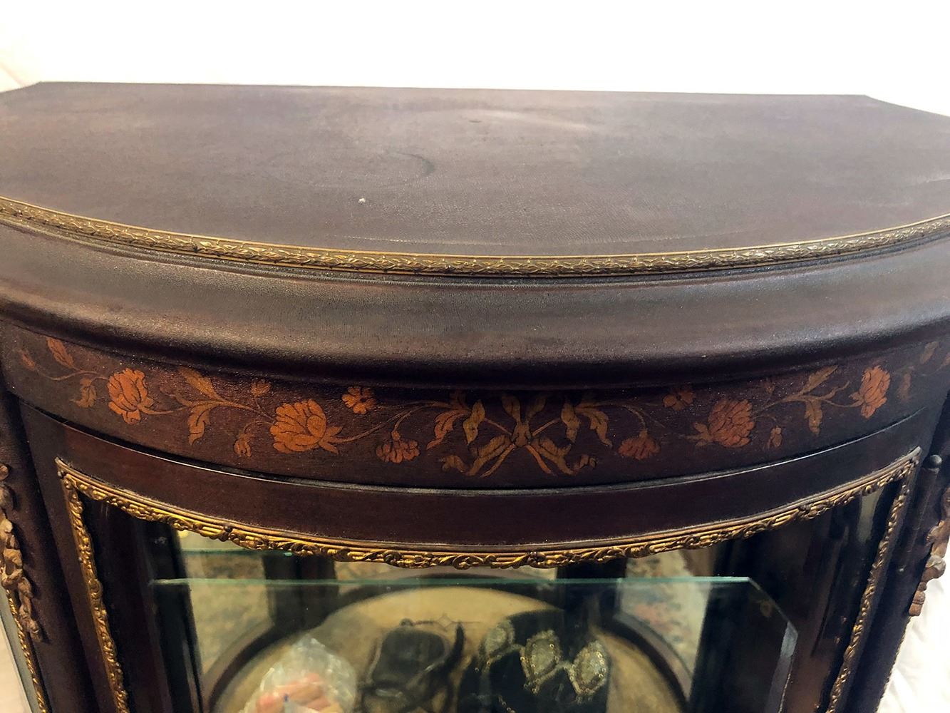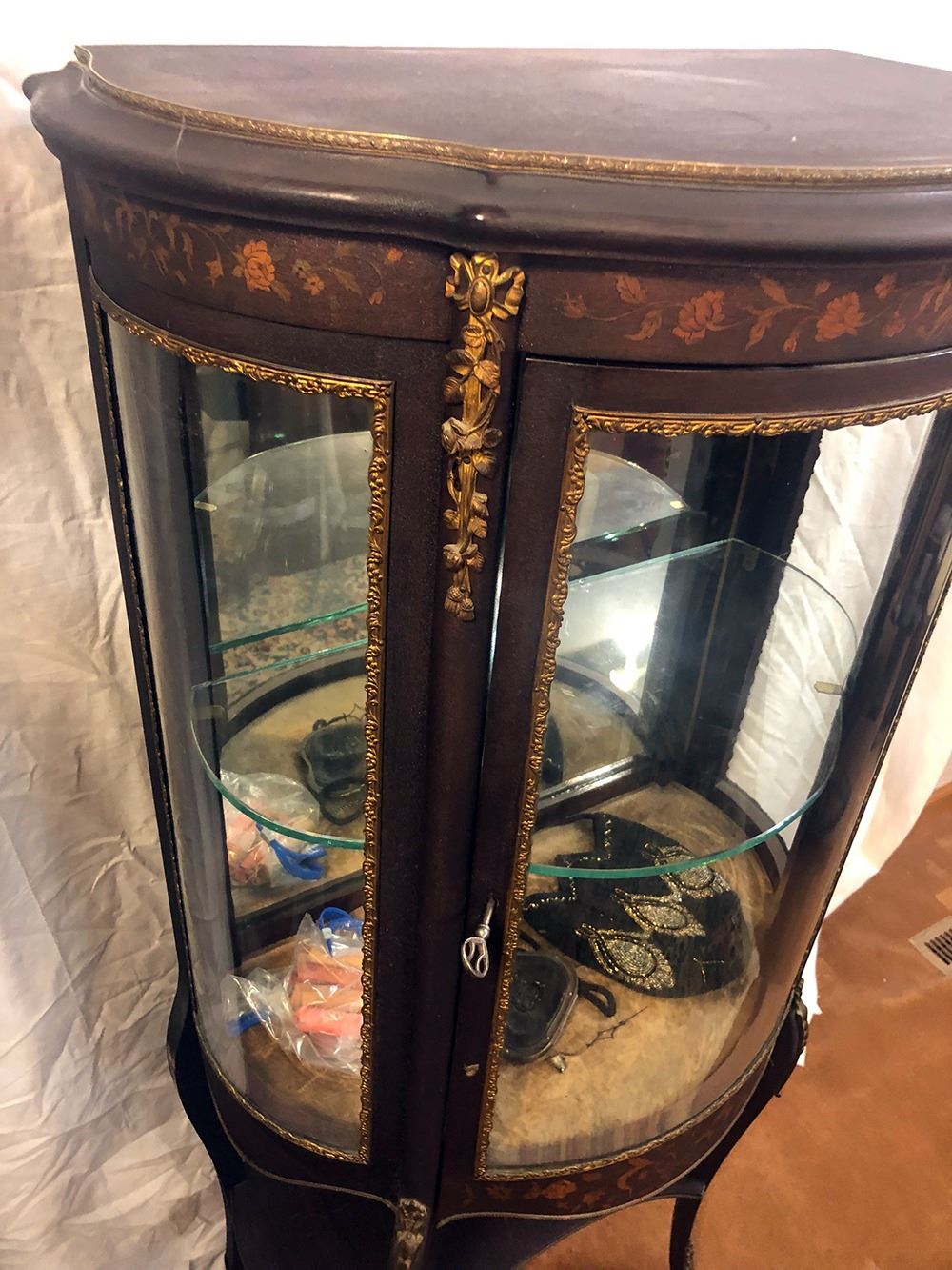 RJ Horner curio with marquetry inlay, bronze mounted, in adorable size, with curved glass, glass shelves, mirrored back, original key, shelf on bottom. Measures approx. 54 inches tall x 24 inches wide.