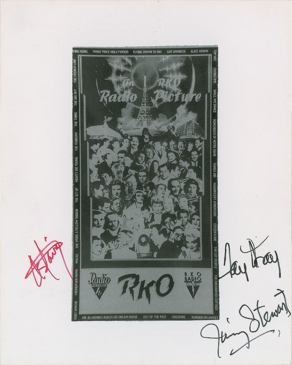 Satin-finish 8 x 10 photo of an RKO Radio Pictures advertisement, signed in the borders in felt tip by Fred Astaire (surname only), James Stewart, and Fay Wray. In fine condition.