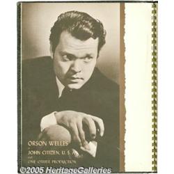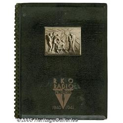 <B>RKO Exhibitor's Book (1940-1941)</B></I> (46 Pages). This handsome hard-bound book is a great presentation of all of the new product offered by RKO in this time just before the outset of WWII. The highlight of the piece is the full page ad for the Orson Welles picture, "John Citizen, U.S.A." Of course, this would soon become "Citizen Kane" and the rest is history. Also pictured are such projects as "Kitty Foyle," "Li'l Abner," and a young Lucille Ball and Desi Arnaz in "Too Many Girls." This book is in solid condition with slight wear to the faux gator cover, but little wear to the interior. Very Fine.