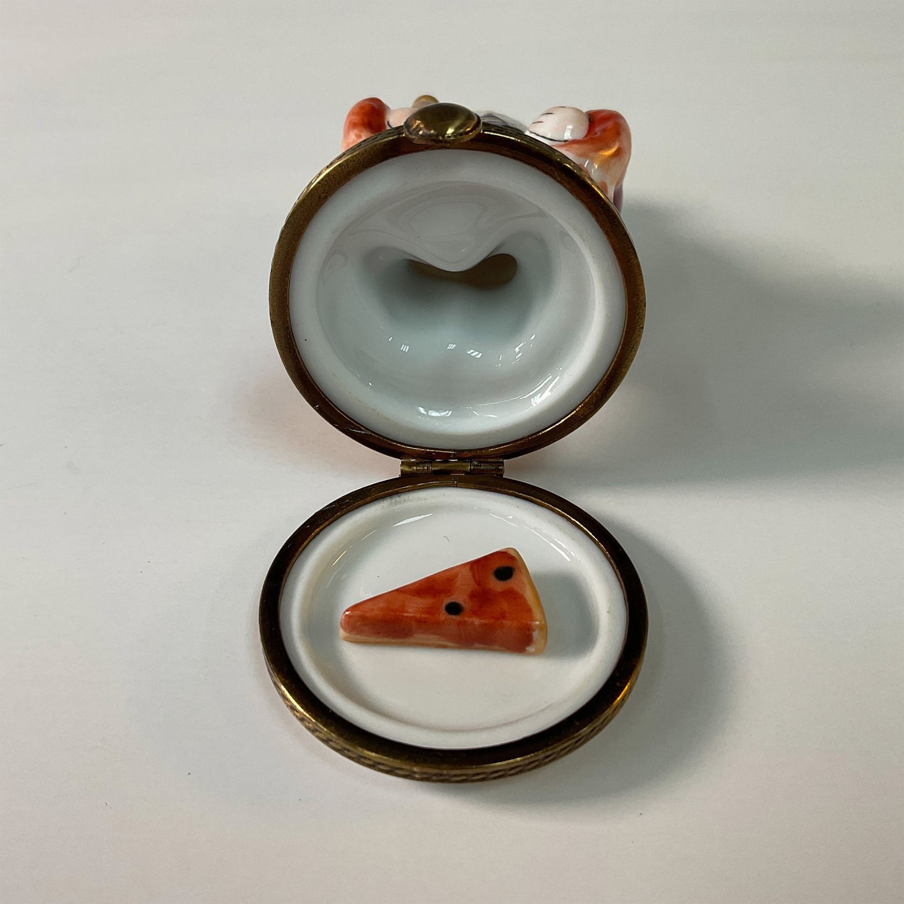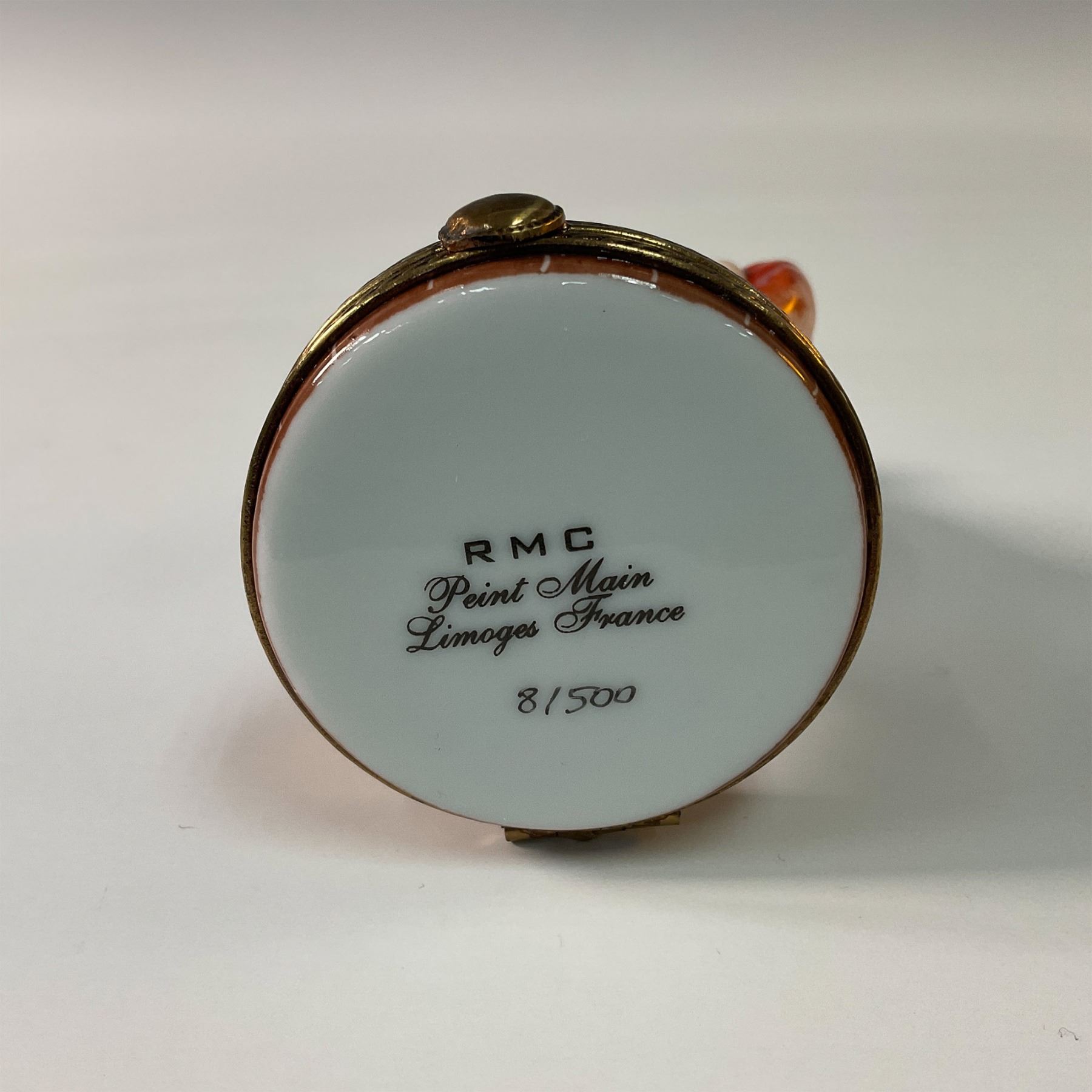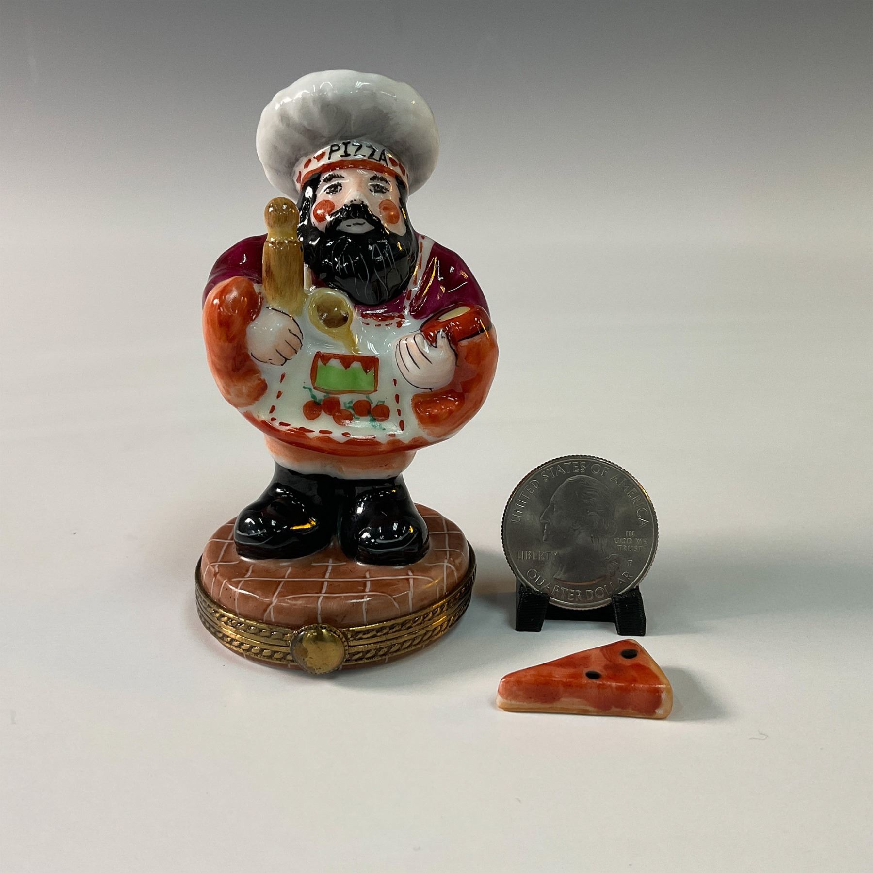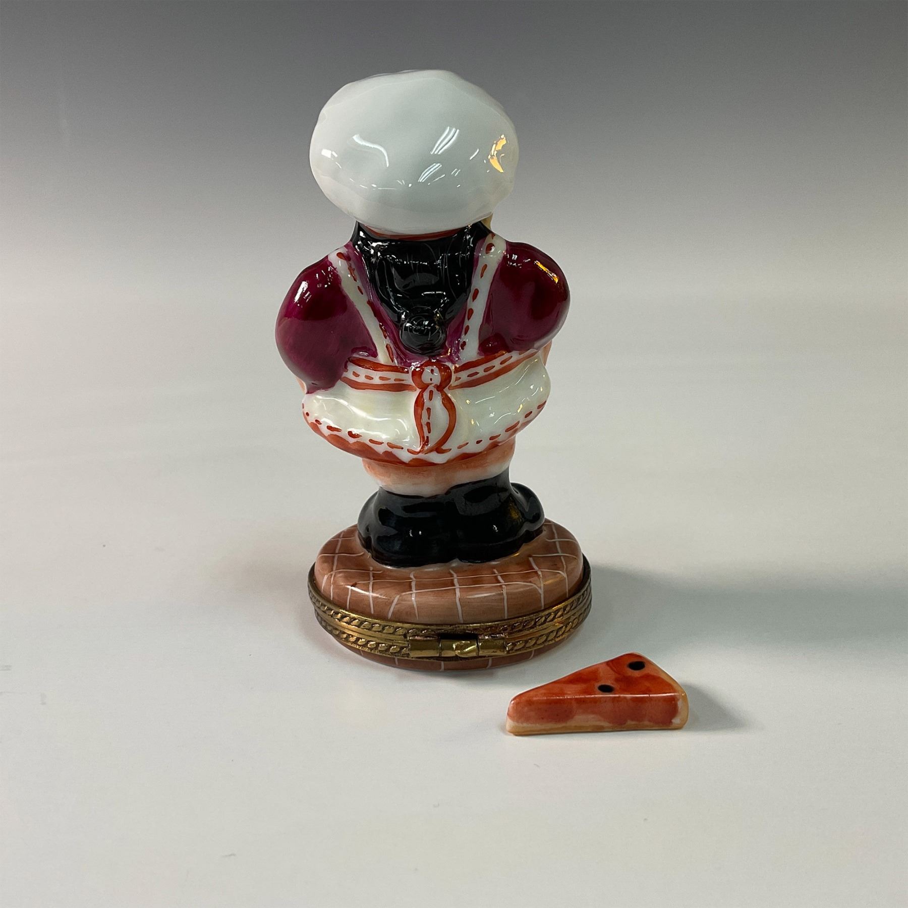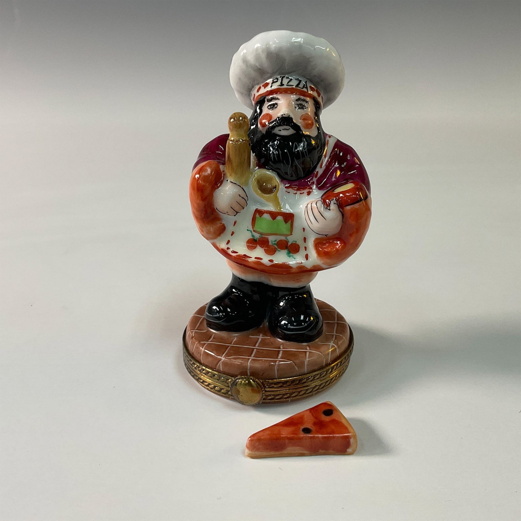 Charming limited edition Limoges porcelain treasure box designed by RMC, crafted in Limoges, France. This whimsical piece is depicted as a cheerful pizza maker holding a rolling pin and a pizza slice. Hand painted with vibrant colors and intricate detailing, it captures the charm and playfulness of Italian cuisine. The treasure box opens to reveal a hidden compartment and includes a miniature porcelain slice of pizza for added character. An ideal addition for collectors of Limoges or those who love unique culinary-themed decor. Marked RMC Limoges, France.