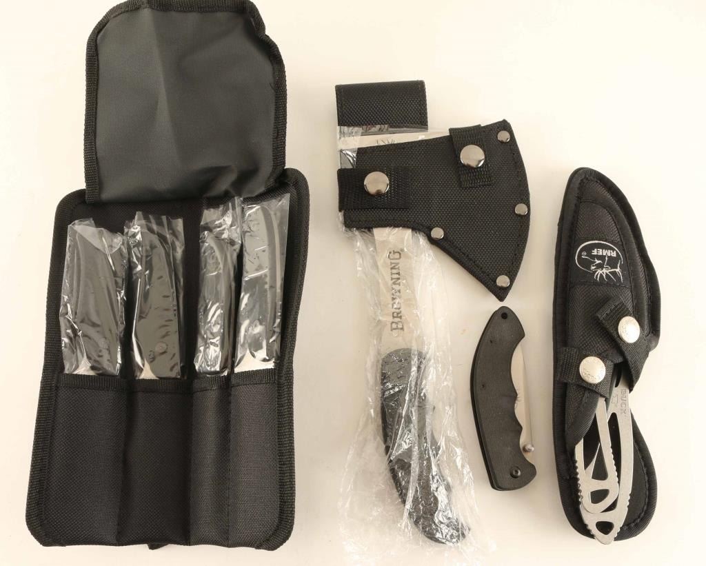 Lot consists of one RMEF Pocket Folder unknown maker, Two RMEF Buck Knives in sheath, a 4 piece skinning set new in box with Browning logo. Bonus Browning mini-hatchet. 7 knives 1 hatchet. See Photos