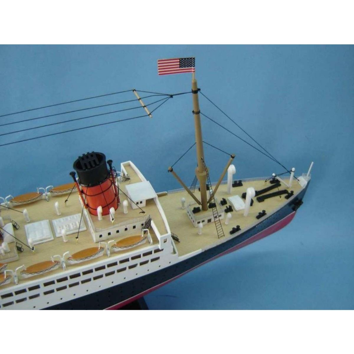 RMS Mauretania Limited Model Cruise Ship 40" w/ LED Lights SOLD FULLY ASSEMBLED Ready for Immediate Display - Not a Model Ship kit Museum-quality craftsmanship, and devoted attention to the finest of details combine to produce an exquisite model cruise ship, the RMSMauretania. This is a replica that truly evokes the grand trans-Atlantic ocean liners in their heyday. Shining like beacons of luxury and opulence, the limited edition scale replica of the RMS Mauretania cruise ship will draw you back to this bygone era of elegance and grandeur. 40" Long x 4.5" Wide x 16" High (1:236 scale) Sold fully assembled - this is not a RMS Mauretania model ship kit LED lighting upgrade over our 40" RMS Mauretania Limited: Bright LED lights line the entire inside of the hull and shine brightly Lifelike lighting when compared to the actual RMS Mauretania due to accurate window and porthole placements Plugs into any electrical outlet - Detachable electrical cord comes out of the back of the base Longevity and brightness (LED light typical usage time 10+ years) Museum Quality features not available in other models or any kit Paint colors precisely matched to those of the RMS Mauretania All windows and portholes exactly sized and positioned according to the original construction plans Historical design and detailing of superstructure and hull Open promenade decks visible through superstructure windows Precise superstructure design and detailing Quadruple propeller design and accurate anchors Metal trussed crane booms with twin cables and pulleys on cargo hooks Lattice grating on ducts and vents Finely-crafted wire maintenance ladders ascend smokestacks Handcrafted from scratch by our master artisians Built from highest quality woods including cherry, birch, maple and rosewood Meticulous painting to accurately match the actual RMS Mauretania Amazing Details, including: Lifeboats hung from launching davits Rigging and stay-lines on all masts and smokestacks Delicate four-wire metal railings on forecastle, aftcastle and atop superstructure All ladders, staircases and handrails produced from delicate metal wire Clear panes in all deckhouse windows Numerous deck objects and features include deck cleats, vent shafts, lattice grates, miniature benches and more Interior lighted cabins and windows Limited production of this RMS Mauretania model Extensive research of original plans, historical drawings and paintings as well as actual photographs ensures the highest possible accuracy.