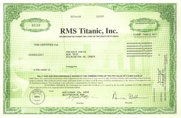 2002. Florida. Stock certificate for one share. Green/White. This document has an underprint vignette in light green of the RMS titanic. The company was formed for salvaging titanic artefacts. Very fine.