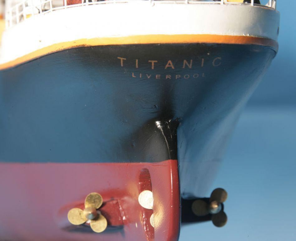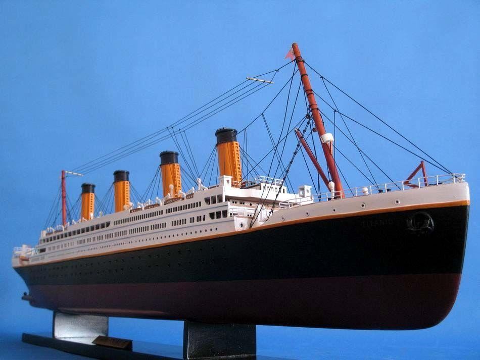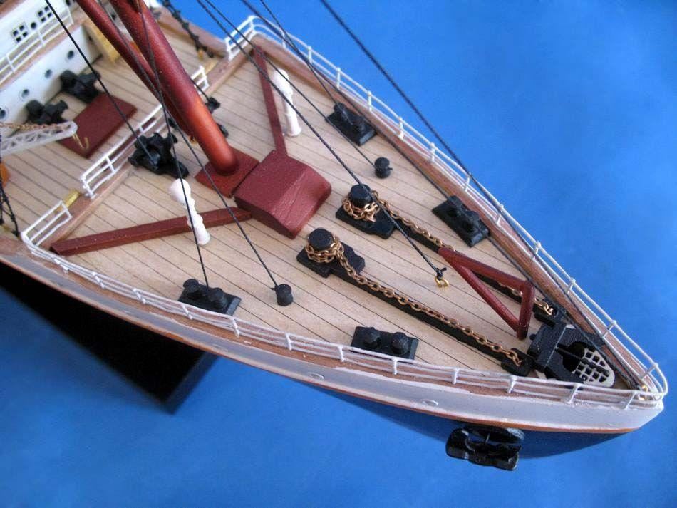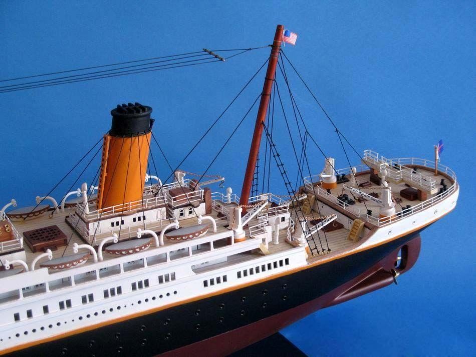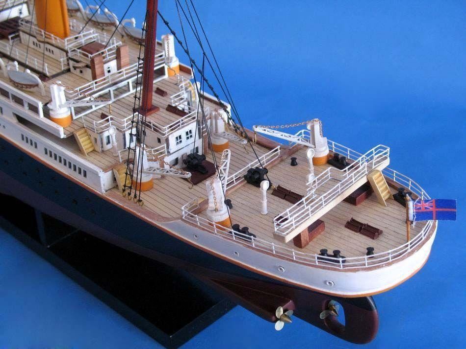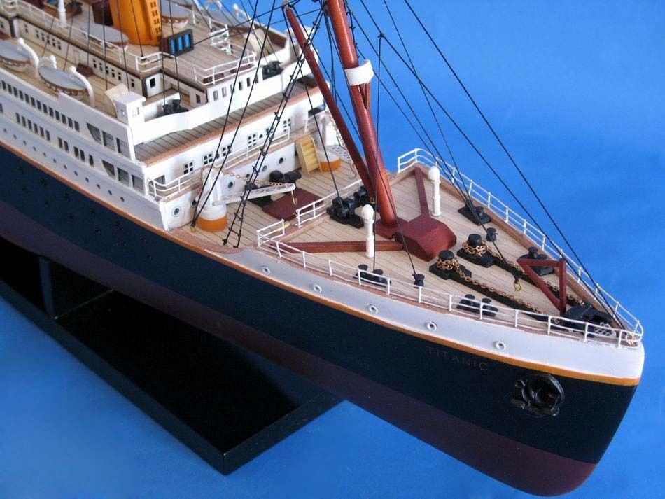 Proud and majestic, these historically accurate scale cruise ship models are a marvelous tribute to the grandest cruise ship of her age and the most famous ocean liner of all time, the RMS Titanic. With careful attention to precise detailing and historical accuracy, this fine replica brings the grandeur of her namesake to whatever room she graces, cruising away in opulence and luxury. 40" Long x 5" Wide x 13.5" High (1:265 scale) Built from scratch by master artisans High quality woods include cherry, birch, maple and rosewood Accurate scale replica cruise ship models of the RMS Titanic Historical design and detailing of superstructure and hull Open promenade decks visible through superstructure windows Precise superstructure design and detailing Triple propeller design and accurate anchors Meticulous painting to accurately match the actual RMS Titanic Amazing Details, including: Painted lifeboats with detailed launching davits Deckhouses feature carved pane windows Interior windows and doors visible through promenade decks Trussed crane arms rather than solid beams feature metal chains and cargo hooks Metal railings on forecastle, aftcastle and atop superstructure Rigging and stay-lines on all masts and smokestacks Numerous deck objects and features include wooden stairs, deck cleats, vent shafts, lattice grates, miniature benches and more Hollow smokestacks with separate-piece maintenance ladder Separate wooden display base supports model Extensive research of original plans, historical drawings and paintings as well as actual photographs ensures the highest possible accuracy
