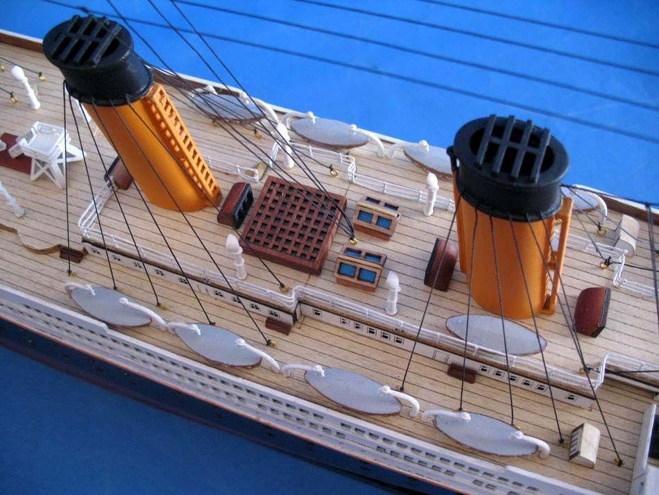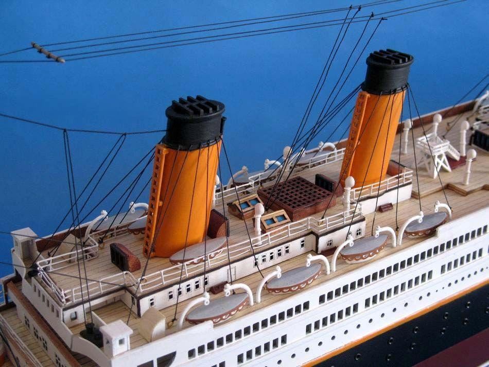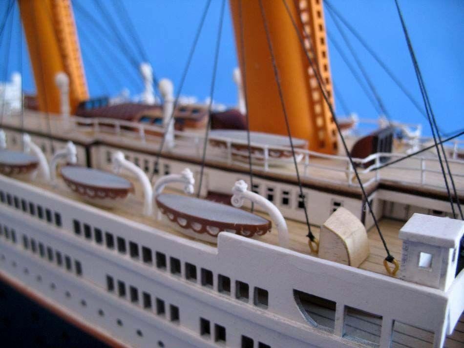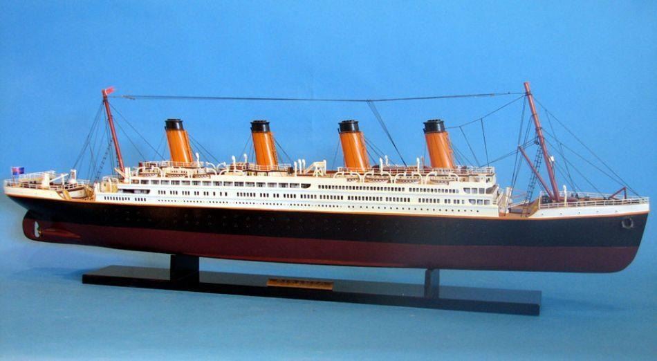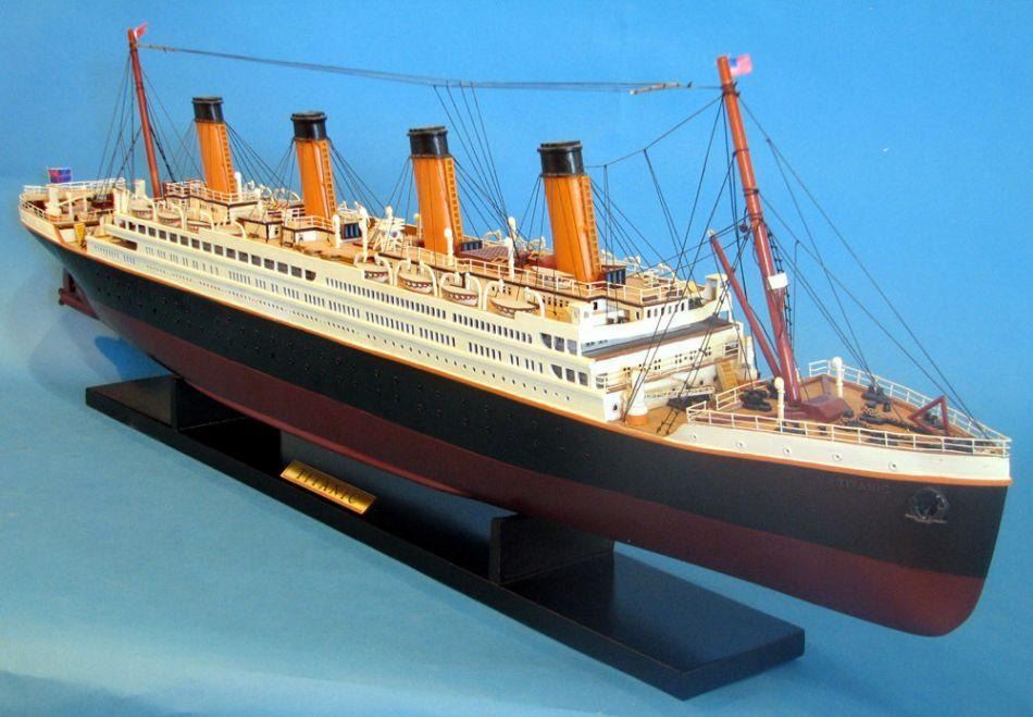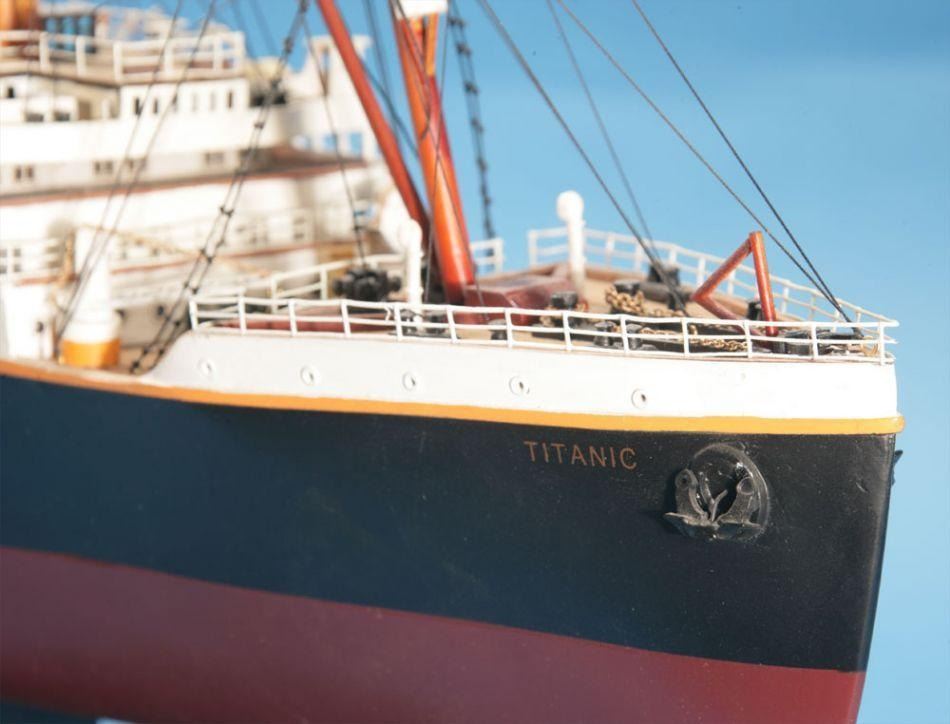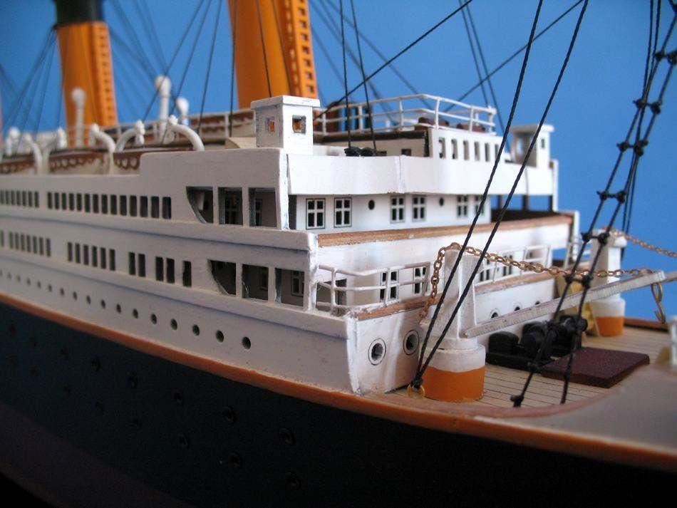 Proud and majestic, these historically accurate scale cruise ship models are a marvelous tribute to the grandest cruise ship of her age and the most famous ocean liner of all time, the RMS Titanic. With careful attention to precise detailing and historical accuracy, this fine replica brings the grandeur of her namesake to whatever room she graces, cruising away in opulence and luxury. 40" Long x 5" Wide x 13.5" High (1:265 scale) Built from scratch by master artisans High quality woods include cherry, birch, maple and rosewood Accurate scale replica cruise ship models of the RMS Titanic Historical design and detailing of superstructure and hull Open promenade decks visible through superstructure windows Precise superstructure design and detailing Triple propeller design and accurate anchors Meticulous painting to accurately match the actual RMS Titanic Amazing Details, including: Painted lifeboats with detailed launching davits Deckhouses feature carved pane windows Interior windows and doors visible through promenade decks Trussed crane arms rather than solid beams feature metal chains and cargo hooks Metal railings on forecastle, aftcastle and atop superstructure Rigging and stay-lines on all masts and smokestacks Numerous deck objects and features include wooden stairs, deck cleats, vent shafts, lattice grates, miniature benches and more Hollow smokestacks with separate-piece maintenance ladder Separate wooden display base supports model Extensive research of original plans, historical drawings and paintings as well as actual photographs ensures the highest possible accuracy