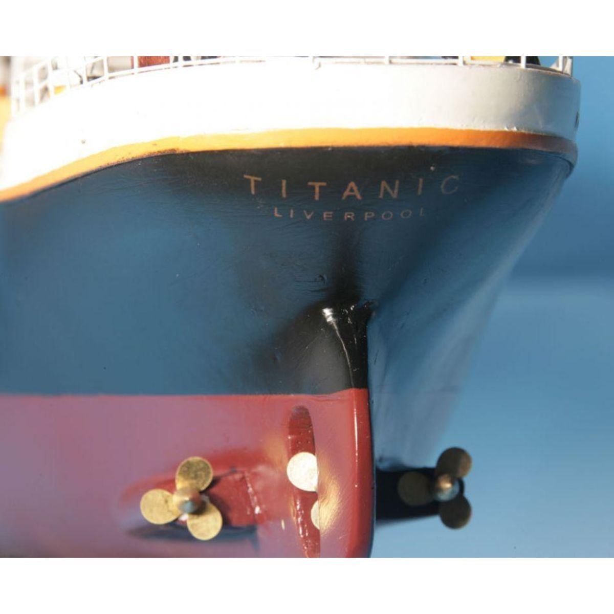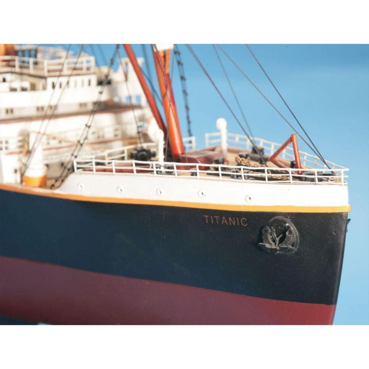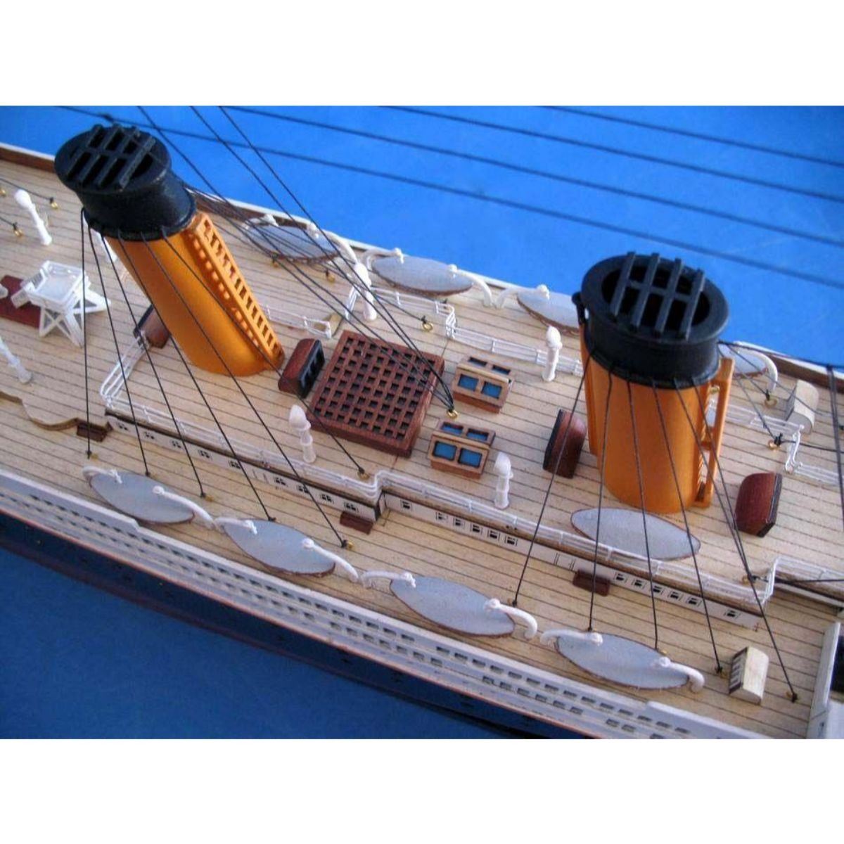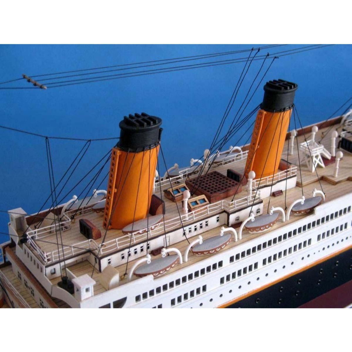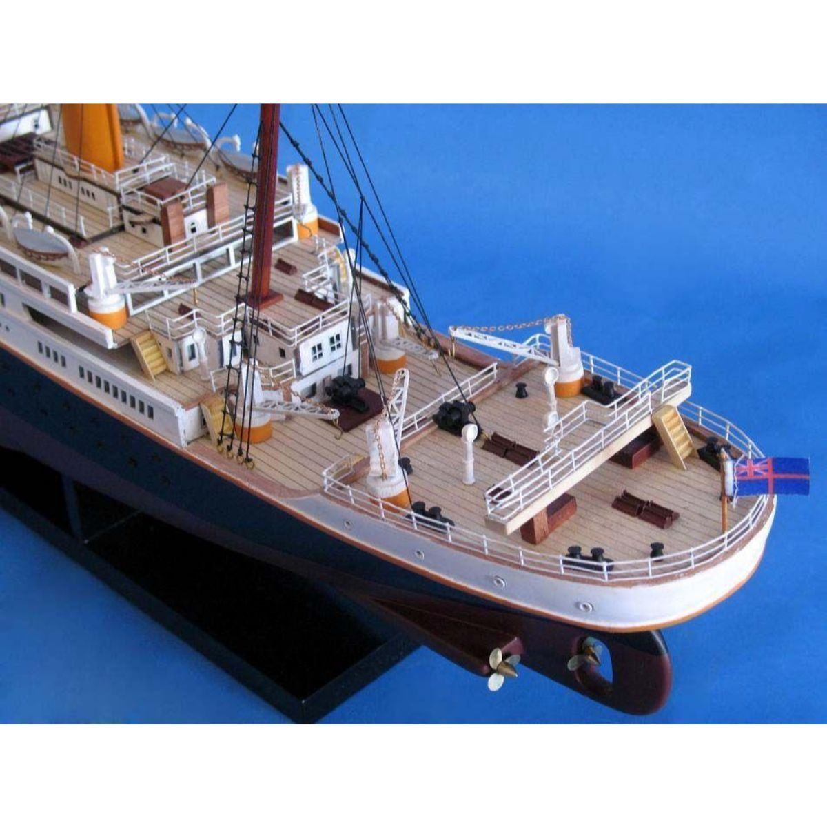 Proud and majestic, these historically accurate scale cruise ship models are a marvelous tribute to the grandest cruise ship of her age and the most famous ocean liner of all time, the RMS Titanic. With careful attention to precise detailing and historical accuracy, this fine replica brings the grandeur of her namesake to whatever room she graces, cruising away in opulence and luxury. 40" Long x 5" Wide x 13.5" High (1:265 scale) Built from scratch by master artisans High quality woods include cherry, birch, maple and rosewood Accurate scale replica cruise ship models of the RMS Titanic Historical design and detailing of superstructure and hull Open promenade decks visible through superstructure windows Precise superstructure design and detailing Triple propeller design and accurate anchors Meticulous painting to accurately match the actual RMS Titanic Amazing Details, including: Painted lifeboats with detailed launching davits Deckhouses feature carved pane windows Interior windows and doors visible through promenade decks Trussed crane arms rather than solid beams feature metal chains and cargo hooks Metal railings on forecastle, aftcastle and atop superstructure Rigging and stay-lines on all masts and smokestacks Numerous deck objects and features include wooden stairs, deck cleats, vent shafts, lattice grates, miniature benches and more Hollow smokestacks with separate-piece maintenance ladder Separate wooden display base supports model Extensive research of original plans, historical drawings and paintings as well as actual photographs ensures the highest possible accuracy