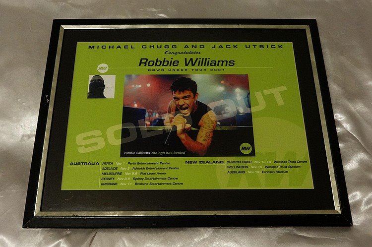 Robbie Williams poster for a Robbie Williams 2001 Australian tour. Frame: 19.5x15 inches.