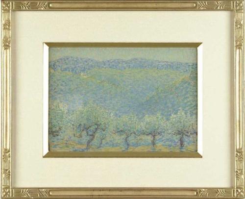 ROBERT ALDEN REASOR (European, 20th Century) ORCHARD IN LANDSCAPE. Pastel scene shows an orchard in the foreground with green and blue hills in background. Signed lower left “Robert Alden Reasor 28”. Housed in an outstanding reproduction carved wood and gilt frame having a linen matte with inner gold liner. SIGHT SIZE: 9-1/2” x 13-1/2”. CONDITION: Very good. 9-26729