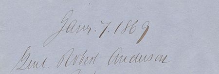 (1805 - 1871) Union brigadier general, the "Hero of Fort Sumter", who refused Confederate demands to surrender the fort and ultimately endured two days of bombardment before capitulating. Fine signature on a small blue sheet: "Jany. 7, 1869 General Robert Anderson". Tipped to another sheet, very good.