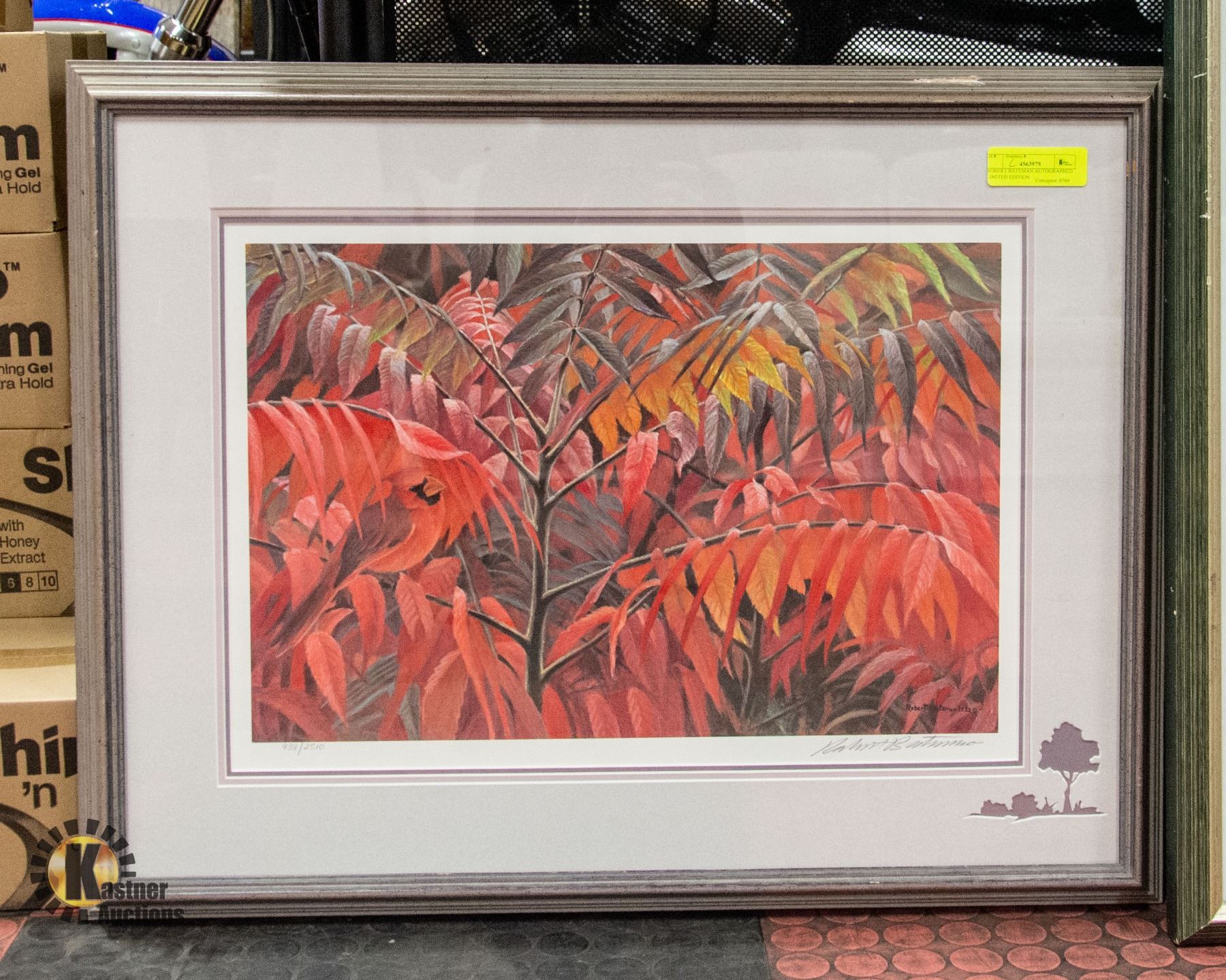 PRINT. 938 / 2510. TITLE "CARDINAL AND SUMAC". 23 IN X 29 IN. UNDER GLASS. PROFESSIONALLY FRAMED. AUTOGRAPHED BY ROBERT BATEMAN **ALL ITEMS MUST BE REMOVED BY 5PM SATURDAY, OCTOBER 5TH 2024. ALL REMAINING ITEMS WILL BE SUBJECT TO A $6.00 PER DAY STORAGE CHARGE. ANY ITEMS REMAINING AFTER MONDAY, OCTOBER 21ST 2024 WILL BE CONSIDERED FORFEITED. NO REFUNDS WILL BE ISSUED FOR FORFEITED ITEMS. TO SCHEDULE A PICK UP APPOINTMENT CLICK HERE