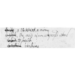 <b>1298. ROBERT BURNS </b>(1759 - 1815) Scottish poet, author of "Auld Lang Syne" and the poems "To a Mouse", and "The Holy Fair". Partial A.Ms. (unsigned), 1p. 4" x 1", [n.p., n.d.], his definition of four words from Scottish vernacular into English!: "<i>Cuifs a blockhead, a niny Crank the noise of an ungreased wheel Claw to scratch Crushin crushing</i>". Light soiling, else fine. Anything in the hand of Burns is, of course, quite rare.<b> $300-500</b>