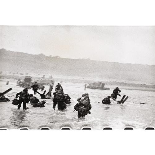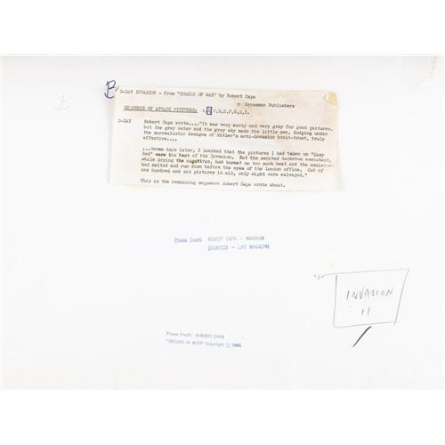 <B>ROBERT CAPA</B></I> (American 1913-1954)<BR><I>Attack Pictures</B></I> Sequence<BR><I>D-Day Invasion-Images of War (Sequence B),</B></I> 1944<BR>Gelatin silver print<BR>11 x 14 inches (27.9 x 35.6 cm)<BR>One of the ten photos selected from the eleven surviving negatives and published by LIFE on June 19, 1944. <BR><BR>Provenance:<BR>The Collection of Mrs. Rowena Nadig (San Antonio, Texas)<BR><BR> <B>Condition Report:</B> Normal signs of wear as appropriate with age<BR><BR><b>Shipping:</b> Requires 3rd Party Shipping (<a target="_blank" href="http://www.heritageauctions.com/common/shipping.php">view shipping information</a>) <BR><BR><B>Important notice: