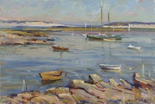 ROBERT CHARLES GRUPPE (American, 1944-) TRANQUIL COVE. Unframed oil on canvas scene shows a calm inlet with several boats at mooring including a large green schooner. A couple of sails are seen going towards open ocean. Appears to be a North Shore Massachusetts scene. Signed lower right. SIZE: 24" x 36". CONDITION: Very good to excellent. 9-27174