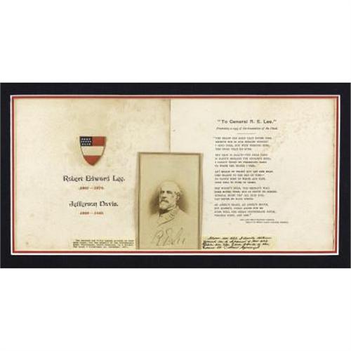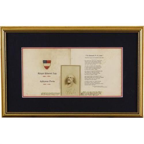 <B>ROBERT E. LEE: A FINE SIGNED </B></I><B><I>CARTE DE VISITE</B></I></B></I><B> IN UNIFORM</B></I>. A classic Vannerson and Jones image, with a large “R E Lee” signature below his portrait. It has been attractively framed along with a colorful 1891 booklet including an ode “To General Robert E. Lee” (the booklet was printed in an edition of just 250, and sold to benefit the Confederate Home in Charleston, Virginia). The <I>carte</B></I> itself is in very good condition with intact square corners; a very pleasing example for display.<BR><BR><b>Shipping:</b> Framed - without Glass, Medium (<a target="_blank" href="http://www.heritageauctions.com/common/shipping.php">view shipping information</a>)