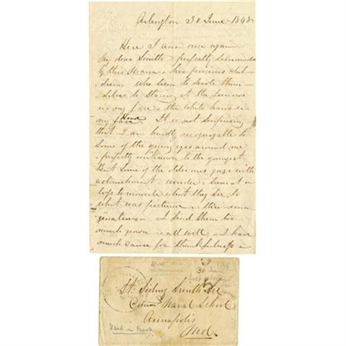 <B>ROBERT E. LEE: ANTEBELLUM AUTOGRAPH LETTER SIGNED.</B></I> “<I>R E Lee</B></I>”, four pages, 4.75” x 7.25”, Arlington, Virginia, June 30, 1848, to Sidney Smith Lee, Annapolis, Maryland. Here the future Confederate general, recently back from the Mexican War, writes in small part to his brother of the homecoming, “<I>...Here I am once again, my dear Smith, perfectly surrounded by this Mama & her precious children, who seem to devote themselves to staring at the furrows in my face and the white hairs in my head. It is not surprising that I am hardly recognizable to the young eyes around me…</B></I>”. With original cover postmarked at Alexandria. <BR><BR><B>Condition:</B></I> Fine.<BR><BR><b>Shipping:</b> Flat Material, Small (<a target="_blank" href="http://www.heritageauctions.com/common/shipping.php">view shipping information</a>)