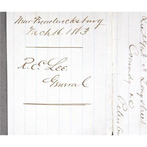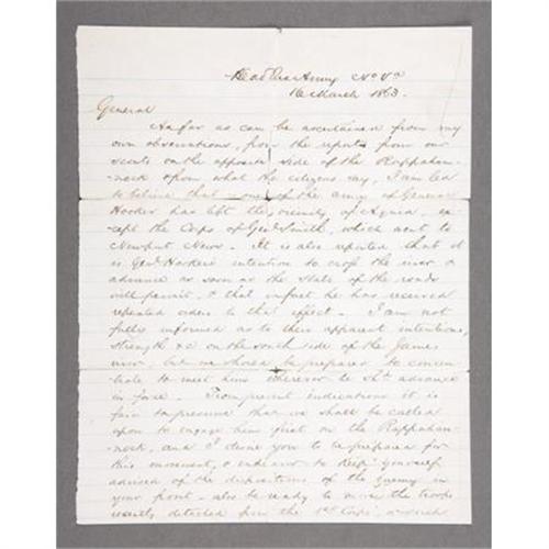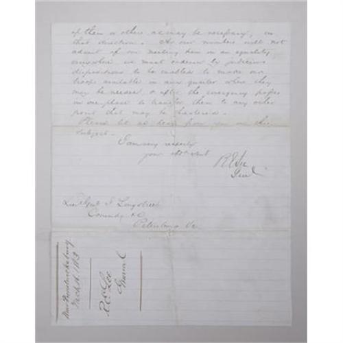 <B>ROBERT E. LEE AUTOGRAPH LETTER SIGNED, MARCH 16TH 1863, TO GENERAL LONGSTREET.</B></I> In the summer of 1863, the two armies faced each other across the Rappahannock Rapidan Rivers defense line. General Robert E. Lee decided to make a move to shift the war to the North and hopefully end it. It was the Battle of Chancellorsville, being a major battle fought near the village of Spotsylvania Courthouse, Virginia, from April 30 to May 6, 1863. Called Gen. Robert E. Lee's "perfect battle" because of his risky but successful division of his army in the presence of a much larger enemy force, the battle pitted Union Army Maj. Gen. Joseph Hooker’s Army of the Potomac against an army half its size, Lee's Confederate Army of Northern Virginia. Lee's audacity and Hooker's timid performance in combat combined to result in a significant Union defeat. The Confederate victory was tempered by the mortal wounding of Lt. Gen. Thomas J. "Stonewall" Jackson to friendly fire, a loss that Lee likened to “Losing my right arm.” The Chancellorsville campaign began with the crossing of the Rappahannock River by the Union army on the morning of April 27, 1863. Heavy fighting began on May 1 and did not end until the Union Forces retreated across the river on the night of May 5th to May 6th. This document premeditates the events of that famous Battle of Chancellorsville, written in General Robert E. Lee’s hand. <BR><BR><I>“Headquarters Army No. V.A. (Near Fredericksburg, Virginia) 16 March 1863, General (J. Longstreet) As far as can be ascertained from my own observations, from the reports from own accounts on the opposite side of the Rappahan-nock from what the citizens say, I am led to believe that none of the army of General Hooker has left the vicinity of Aquia, except the corps of Gen. Smith, which went to Newport News. It is also reputed that it is Gen. Hooker’s intention to crop the river & advanced as soon as the State of the roads will permit, & that in fact he has received repeated orders to that effect. I am not fully informed as to their apparent intentions, strength & on the South side of the James River, but we should be prepared to concentrate to meet him wherever he should advanced in force. From present indications it is fair an presume that one shall be called upon to engage him first on the Rappahan-nock, and I desire you to be prepared for this movement , & endeavor to keep yourself advised of the dispositions of the enemy in your front. Also be ready to move the troops recently detached from the 1st. Corp, on such of them or others as may be necessary, in that direction. So our numbers will not admit of our meeting him on an equality everywhere, we must endeavor by indecisions dispositions to be enable to make our troops available in any quarter where they may be needed & after the emergency hopes in one place to transfer them to any other point that may be threatened. Please let me hear from you and this subject. I am very respect your Obt. Srt. R.E.Lee” </B></I><BR><BR><B>Condition:</B></I> Very good, has been separated at folds, some repairing with archival tape.<BR><BR><b>Shipping:</b> Flat Material, Small (<a target="_blank" href="http://www.heritageauctions.com/common/shipping.php">view shipping information</a>)