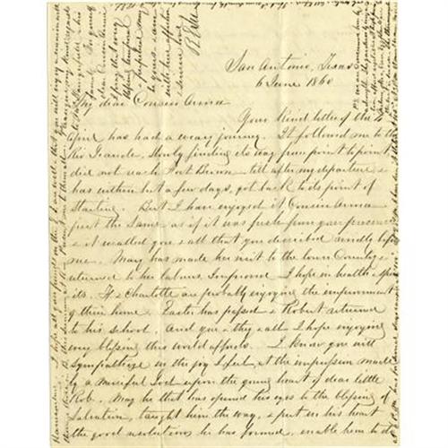 <B>ROBERT E. LEE AUTOGRAPH LETTER SIGNED.</B></I> “<I>R E Lee</B></I>”, four pages, 7.75” x 10”, San Antonio, Texas, June 6, 1860, to Anna Fitzhugh, n.p. An excerpt from this very letter appeared in Douglas Southall Freeman’s acclaimed 1934 biography of Robert E. Lee as follows: <I>“…At this distance from those you love & care for, with the knowledge of the vicissitudes and necessities of life, one is rent by a thousand anxieties, & the mind as well as the body is worn and racked to pieces. But I will not dear Cousin Anna impose my sad thoughts on you, for a man may manifest & communicate his joy, but he should conceal & smother his grief as much as possible. Touching your kind wishes for my speedy return, you know the embarrassment that attends it. A divided heart I have too long had, & a divided life too long led. That may be one cause of the small progress I have made on either hand, my professional & civil career. Success is not always attained by a single undivided effort, it rarely follows a halting, vacillating course. My military duties require me here, whereas my affections and urgent domestic claims call me away. And thus I live & am unable to advance either. But while I live I must toil and trust…</B></I>”. <BR><BR>Few items appearing on the market reveal those personal demons that plague even our most cherished and admired American icons. This intimate letter is a fascinating excursion into the depressed psyche of 53 year-old Lt. Colonel Robert E. Lee wherein he judges himself a failure as both an officer and as a family man. Very important.<BR><BR><B>Condition:</B></I> Very good, with splits along the folds, else crisp and bold.<BR><BR><b>Shipping:</b> Flat Material, Small (<a target="_blank" href="http://www.heritageauctions.com/common/shipping.php">view shipping information</a>)