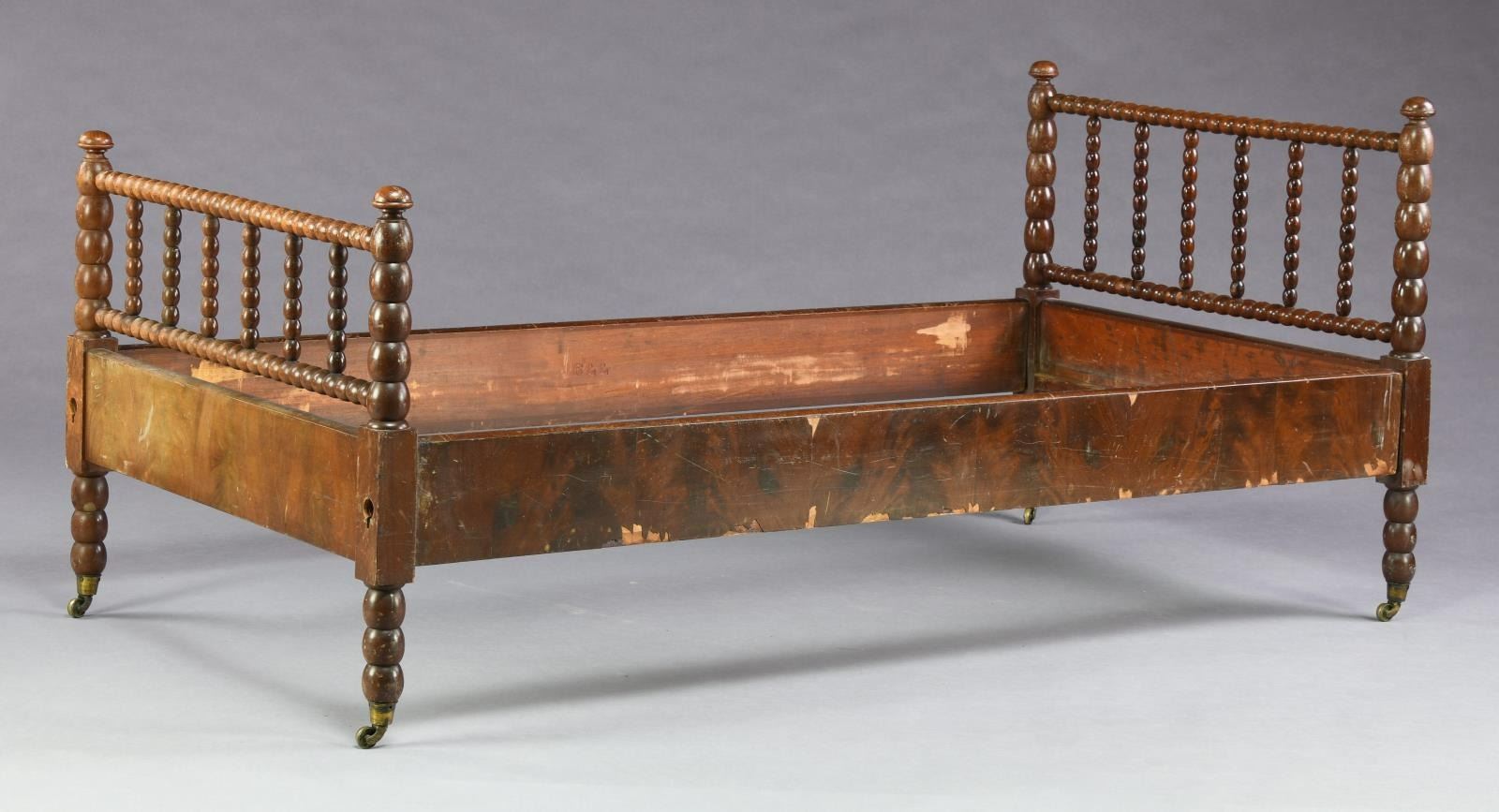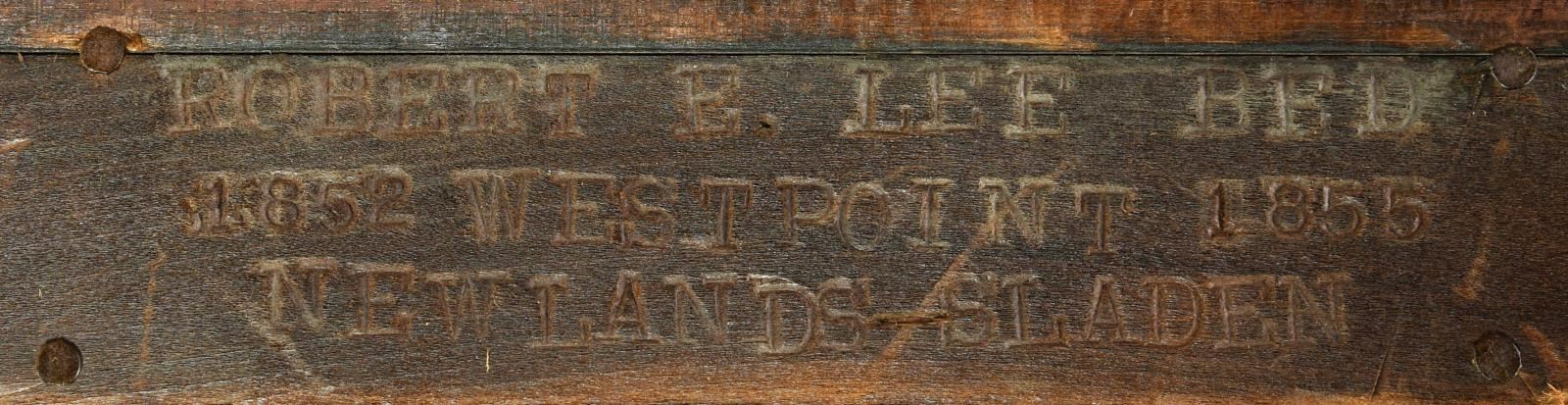 AS SUPERINTENDENT. Robert E Lee was among the greatest American military officers. He was renowned among his West Point peers and later generations of West Pointers. Ironically in the 21st century, West Point has removed his portrait from library and is changing names of "Lee" Gate, "Lee" Road, "Lee" Hall, etc. In the 1920s Robert E. Lee was still renowned name for its current superintendent who was very proud to have been given the "Robert E. Lee" bed from last caretaker Frank Newland, superintendent of cadet stores for many years. His daughter, Miss Mary Newland was postmistress for many years, and she gave the bed to Mrs. Fred Sladen, who was current superintendent. Only one person can brag that your guest room bed was slept on and owned by Robert E. Lee when West Point superintendent, this is you opportunity! This 1850 vintage mahogany veneered spool bed up till last year was used as a guest bed at home of the last Fred Sladen, last male descendant of the Sladen military dynasty. The mahogany veneered bed is numbered "779" and stamped "ROBERT E. LEE BED / 1852 WEST POINT 1855 / NEWLANDS-SLADEN" on footboard. "Loach & Clarkes Patent" brass casters (patented 1841) are on each foot. Part of letter concerning bed: "As you know, when Robert E Lee was assigned to the position of Superintendent of U.S. Military Academy in 1852 he arranged for some of his furniture to be transported to West Point from the Lee Mansion. After leaving his post as Superintendent in 1855, Robert E Lee gave a bed of his to Mr. Francis Newlands, Clerk of Headquarters, USMA. Upon Newlands' death, Newland's daughter, Mary Newlands, inherited the bed. Miss Newlands served as the postmistress of West Point from 1897 to 1923. My grandfather, Major General Fred W Sladen, class of 1890, was Tactics Instructor in 1901, Post Adjutant in 1903, Commandant of Cadets in 1911 and Superintendent of USMA in 1922. During the times my grandfather served at USMA my grandmother, Elizabeth L Sladen and Miss Newlands became good friends. When Miss Newlands retired from West Point, she gave the Lee bed to my grandmother, from whom I have (ultimately) inherited it." UNATTCHED ACCESSORIES: file of research & correspondence by Fred Sladen concerning the Robert E Lee bed. An inventory signed by Fred W Sladen lists furniture in home including front room, one spool bed, antique (Robert E Lee). CDV of Frank Newland, Superintendent of US Military Academy Cadet Stores who had possession of bed prior to Sladen. CONDITION: very good for its age, dings dents and chips to veneer, markings very good, clear cover over markings is missing, 4 nails remain. (02-17895-24/JS). $10,000-20,000.