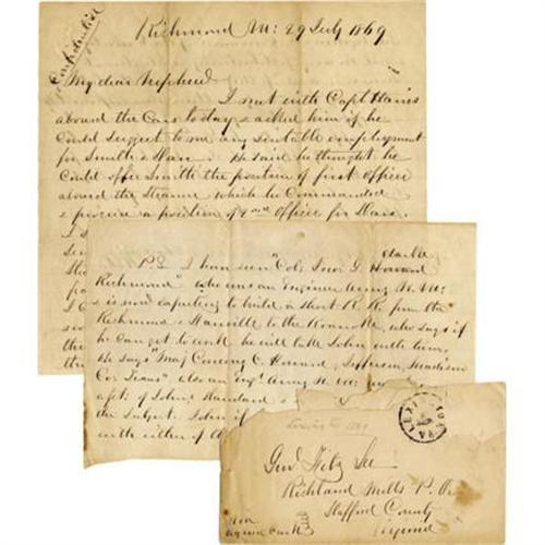 <B>ROBERT E. LEE PARTIAL AUTOGRAPH LETTER WITH POSTSCRIPT SIGNED.</B></I> “<I>R E L.</B></I>”, three pages total, with lower portion missing, Richmond, Virginia, July 29, 1869, to Fitzhugh Lee, Stafford County, Virginia. Labeled “<I>Confidential</B></I>” across the upper left corner, this letter regards finding employment for Sidney Smith Lee, father of Fitzhugh Lee. Unfortunately, the signature has been clipped along with the lower quarter of the sheet. A second sheet, signed with Lee’s initials on the verso, contains a postscript naming two ex-Confederate engineers building a spur line to Roanoke from the existing Richmond & Danville R.R. The letter comes with its original mailing envelope. <BR><BR><B>Condition:</B></I> Good, with stains and folds.<BR><BR><b>Shipping:</b> Flat Material, Small (<a target="_blank" href="http://www.heritageauctions.com/common/shipping.php">view shipping information</a>)