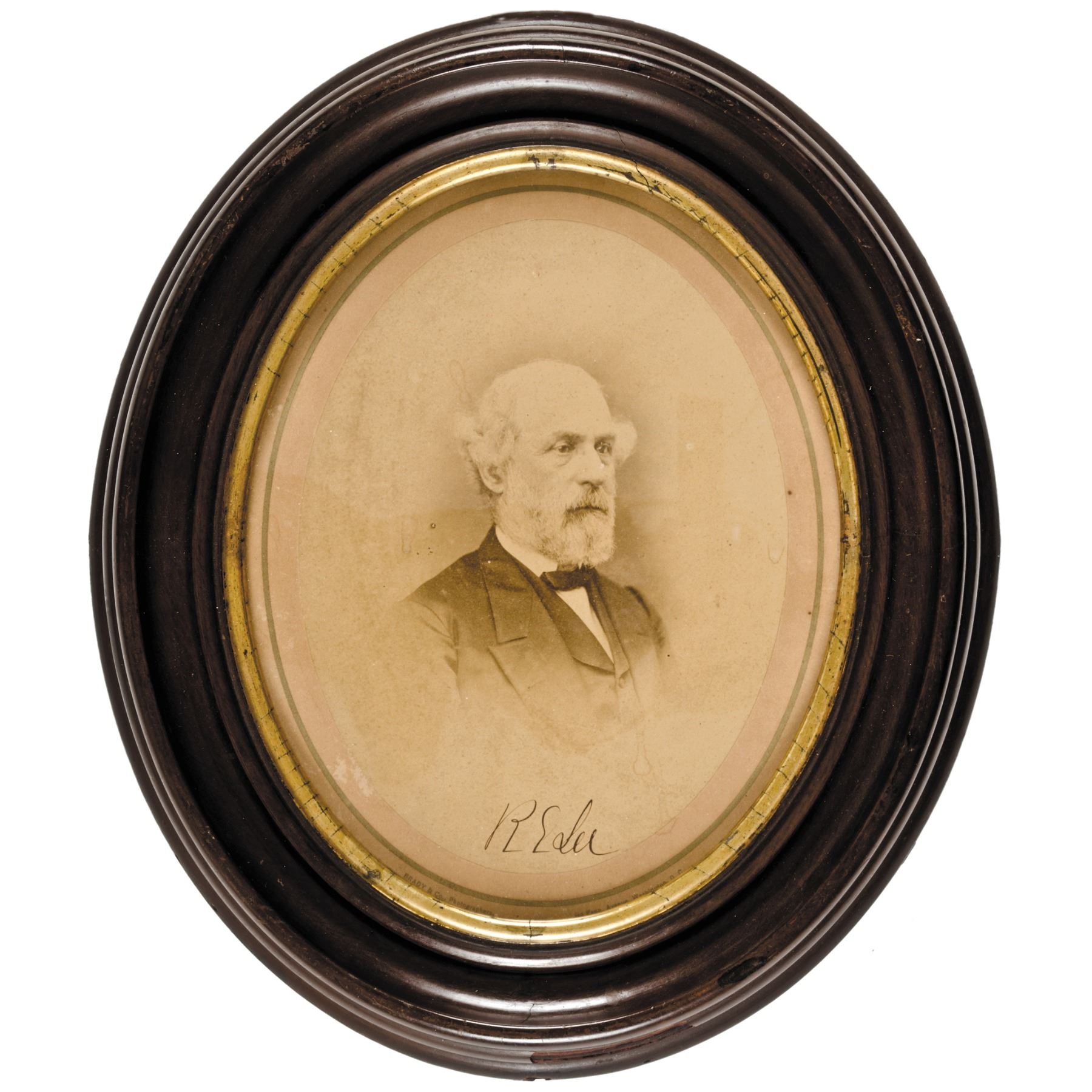 c. 1869 Exceedingly Rare and Impressive Large Format, Albumen Photograph Signed, “R E Lee,” Oval, measuring 7.5” x 9.5” (by sight), Framed, measuring fully to 11.75” x 13.75”, Extremely Fine. This exceptional, historic Photograph was taken by the renowned Civil War era Photographer Mathew Brady in May of 1869. In addition, the original frame back board is attached showing the frame maker’s 3.5” x 4.25” business tag intact. That tag is dated 1860 with the name Stansbury as owner, who later used that frame to house this Photograph image. He attended Washington & Lee College in Lexington, Virginia and was in the Ford Theater when President Lincoln was shot on April 14, 1865!