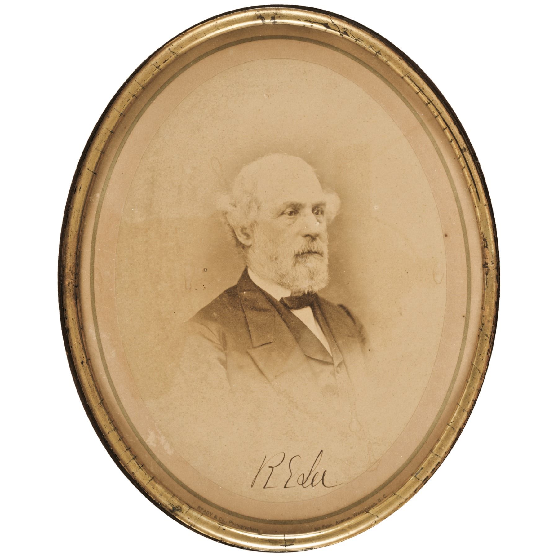 Robert E. Lee sat for this photograph for Mathew Brady, in this semi-profile pose, in May of 1869. Lee was on a visit to Washington, D.C. to meet with then President U. S. Grant. Here, Lee is shown in vignette wearing his fine quality suit. He has magnificently Signed, “R E Lee” in large bold, easily readable strokes at lower portion upon the image itself, measuring 1.75” long and fully .75” tall. This Signed Photograph comes accompanied with a photocopy of the original wooden oval frame, on which a November 1971 typed notation was attached from a descendant of the original owner, which reads, in full: