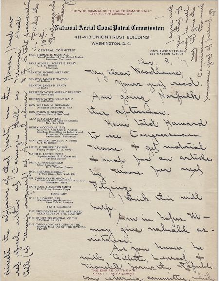 (1856 - 1920) American polar explorer who was the first man to attain the North Pole, arriving by sled on April 6, 1909. A.L.S. "Peary" with initialed postscript on the letterhead of the National Aerial Coast Patrol Commission, 1p. 4to., New York, Dec. 8, 1917 to the president of the Aero Club of America. In part: "...Have told Howard to see Congressman Moore & get materail & map for an article by Moore for next Flying [magazine]. I think this will help...he, with Gillette...forms the Republican steering committee, which directs the affairs of that party...". Sold with an unrelated autograph note, an attachment to a bill to materials "sent out by Mayo Dudley...covering Aviation activities...". Two pieces.