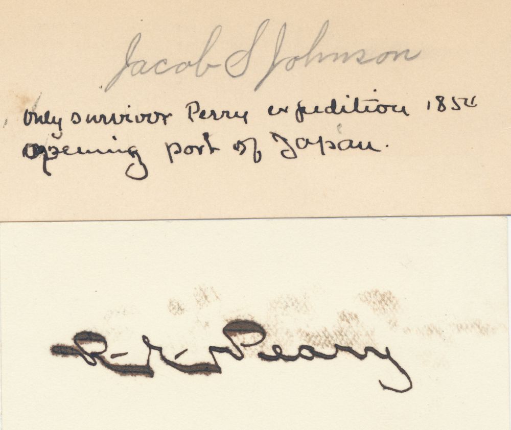 (1856 - 1920) American polar explorer who was the first man to attain the North Pole, arriving by sled on April 6, 1909. Bold signature on a small card a bit smeared. Mounted, overall good condition. Along with JACOB S. JOHNSON, pencil signature on a small card with collector's note "only survivor Perry Expedition 1854...". Two pieces.