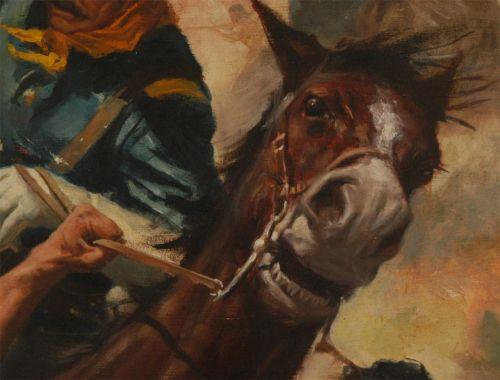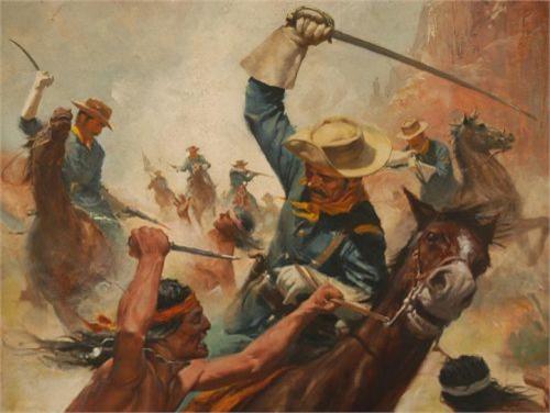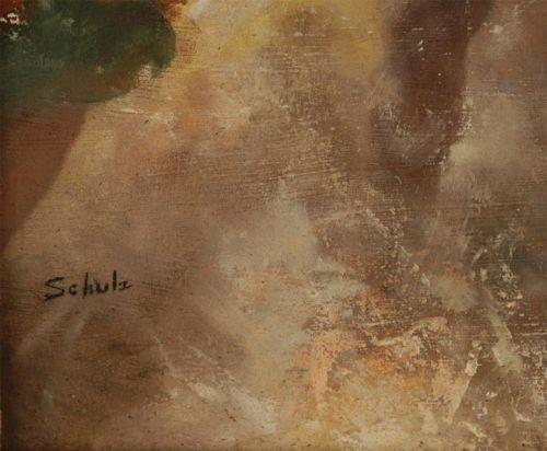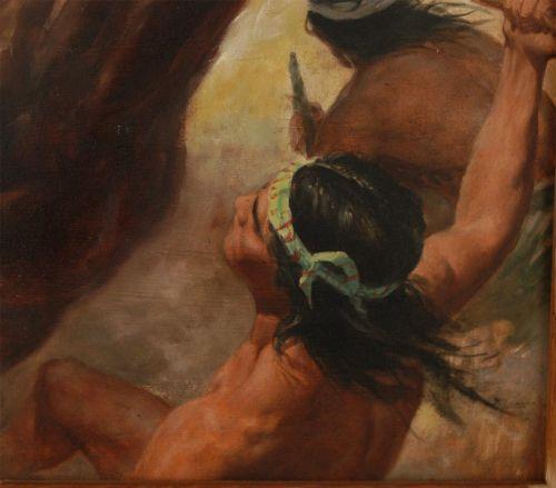 "ROBERT E. SCHULZ Indian Attack, an illustration 30""x22"" oil on canvas signed ll ""Schulz"", excellent but dirty "