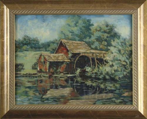 ROBERT EMMETT OWEN (American, 1878-1957) THE RED MILL. Oil on board summer landscape shows connected red mill with large water wheel and mill pond surrounded by tall green trees. Signed lower right "R. Emmett Owen". Housed in a fine gilt ogee style frame with gadrooned decoration. SIZE: 17" x 22". CONDITION: Very good. 9-27599