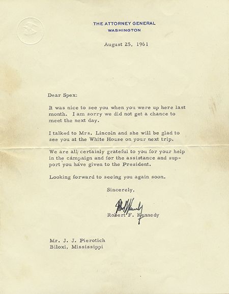 (1925 - 1968) American politician who successfully managed his brother John's presidential campaign and was later appointed Attorney General. He was assassinated in 1968 while running for president. T.L.S. as Attorney General, 1p. 4to., Washington, Aug. 25, 1961 to J. J. "Spex" Pierotich of Beloxi, Miss. apologizing that he was not able to meet with him personally when he was in Washington in July and adding, " I talked to Mrs. Lincoln and she will be glad to see you at the White House on your next trip. We are all certainly gratefully to see you for your help in the campaign and for the assistance and support you have given the President..." One horizontal fold, moderate soiling at margins, else very good. Offered with the original transmittal envelope.