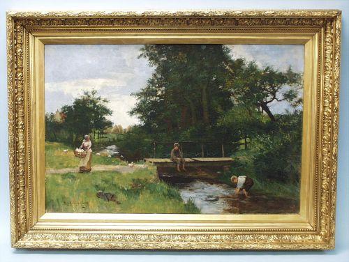 ROBERT GEMMEL HUTCHISON (1855-1936) English school. "Landscape with Small Creek and Figures." Oil on canvas. Signed lower left. 23 3/4" x 35 1/2". In gilt frame. Ref. Benezit, vol.5, page 38.