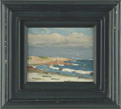 ROBERT HENRY LOGAN (American, 1875-1942) BEACH WITH FIGURES. Oil on panel scene shows several people seen on beach and rocks with small waves. An island is seen off shore under a cloud and blue sky. Signed lower left "R. Logan". Housed in a painted black molded wood frame. SIZE: 6-1/4" x 7-1/2". CONDITION: Very good. 9-27217